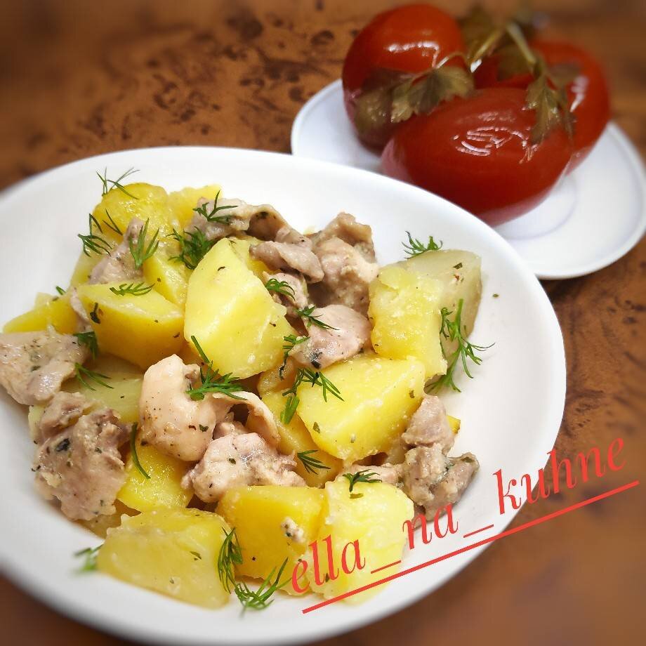 Когда надо быстро и много😁. Ингредиенты: картофеля, филе куриных бёдер, ст л майонеза, ст л горчицы, ст л соевого соуса, ч л без горки специй, воды, Соль по вкусу, Подать с помидорами Способ приготовления: Мясо нарезать и замариновать на 30-40 минут в смеси майонез+соус+горчица+специи. Пока маринуется мясо, почистить и нарезать картофель. Выложить в форму для запекания, посолить. Добавить мясо, хорошо перемешать и влить воду. Накрыть крышкой/фольгой и поставить на 35-40 минут в предварительно разогретую духовку при 180°. Убрать крышку/фольгу и доготовить ещё минут 20-25 (смотрите по готовности картофеля(. Приятного аппетита😍! Если вам по душе мои незатейливые рецепты: подписывайтесь и оставляйте свои фотоотзывы📸!