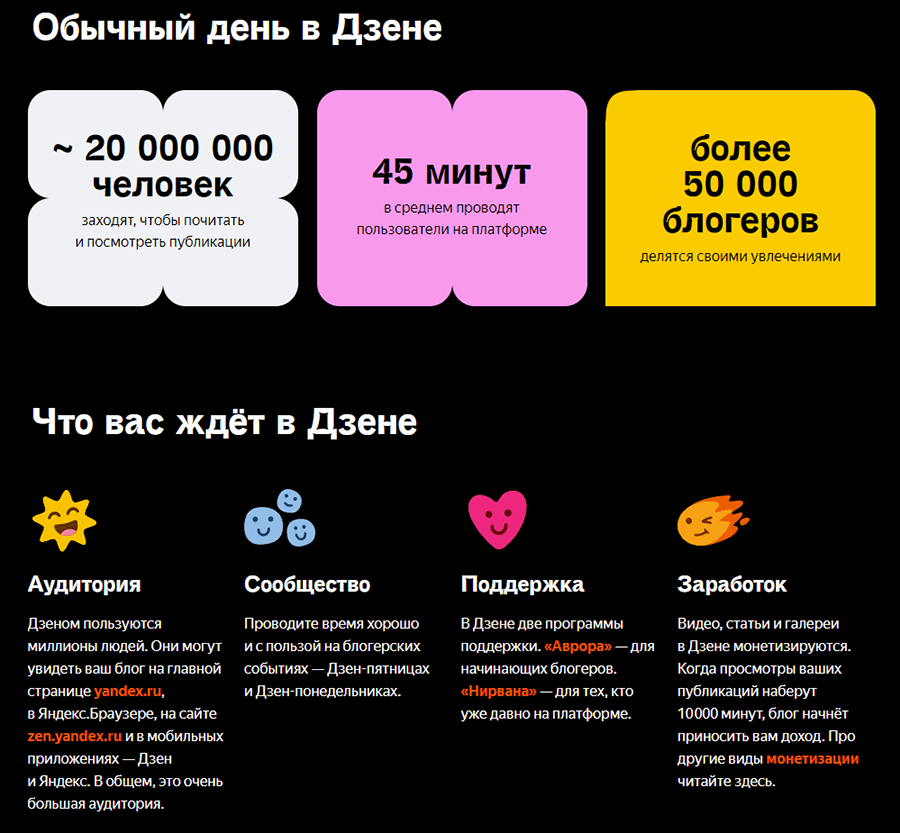 Яндекс.Дзен — это рекомендательная платформа от одноименной компании, которая сейчас очень популярна. Блоки со статьями Дзена можно найти на различных крупных порталах, в Яндекс.Браузере и в других местах. Любой желающий может создать канал и начать публиковать статьи (длинные тексты), посты (короткие, как в твиттере) или видео. Еще с недавних пор там можно стримить (проводить видеотрансляции). Каждую публикацию анализирует ИИ, он выявляет категорию читателей, которым эта публикация может быть интересна. Далее платформа начинает закидывать публикации в ленту таких пользователей. Если они будут проявлять интерес, заходить на статью и дочитывать ее — платформа будет продвигать материал дальше. Основными мерилами здесь являются просмотры и дочитывания — те самые визиты, во время которых человек прочитал ваш материал или посмотрел видео полностью. Учитывается не просто время нахождения на странице со статьей, но и поведенческие факторы: прокрутки, движения курсором, написание комментариев