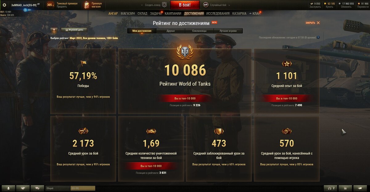 Приветствую Танкисты! Мне 42 года, и я с 2012 года играю в World of Tanks. В марте 2022 случилось значимое для меня достижение в нашей любимой игре. Впервые за всю мою историю игры я смог преодолеть отметку в 10 000 по рейтингу от WG. WG рейтинг не так популярен как Wn8, но служит хорошей альтернативой. Самым важным считаю то, что он обновляется каждый месяц и Вы можете ежемесячно начинать с чистого лица. Используя WG рейтинг пропадает необходимость в создании твинка и у всех игроков мира танков есть возможность проявить себя на ежемесячной основе. Для ориентира я выбираю игроков с более высокой эффективностью и стремлюсь превзойти их. В марте 2022 г. мне удалось обойти таких известных блогеров как Юшу (ПроТанки), Барабекуса и Вспышку. Хотя я обычно значительно отставал от них. Также статистика от WG позволяет оценить мою эффективность по танкам и понять, где нужно поработать над скиллом. Прихожу к выводу, что мой подход к изучению карт и тактик приносит результаты. Я медленно, но увер