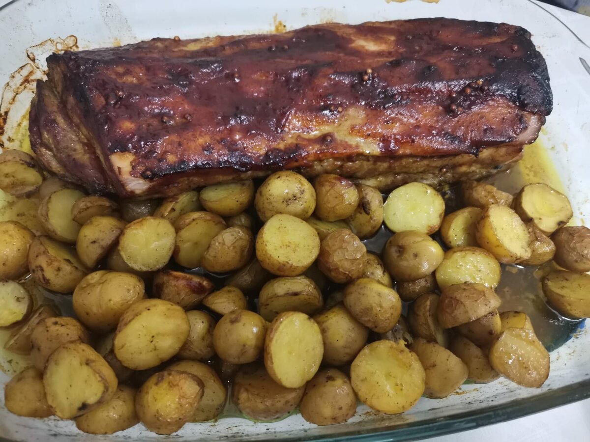 Добрый день дорогие друзья. Сегодня мы переехали на новую квартиру в которой есть духовка и поэтому сегодня мы будем готовить блюдо в духовке. Свиные ребрышки, запеченные под соусом барбекю. Для удобства поиска рецептов используйте «Путеводитель по рецептам» Для начала замаринуем наши рёбра. Натираем их хорошенько солью, смесью перцев, зубчики чеснока так же мелко-нарезаем или натираем на тёрке. Добавляем немного соевого соуса, специй по вкусу(какие вы предпочитаете), я взял паприку и немного карри. Еще я добавил немного кориандра в виде зёрен и примерно 100гр минеральной воды (можно взять простую) . Оставляем наши ребра на сутки, периодически переворачивая в маринаде, чтобы мясо на них промариновалось до косточек. На следующий день готовим. На гарнир я выбрал мини-картофель. Можно заменить на обычный, порезав его дольками, прямо с кожурой. Только не забудьте хорошо его промыть перед использованием. Крупные клубни нарезаем на пополам. Мариную я картофель так же в чесноке, немного соли,
