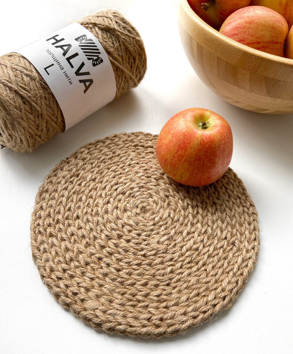 Вязания подставки под горячее или салфетки крючком узором «верблюд». 🌱 Джут Halva можно купить у Пряжа Центр с 5% скидкой по промокоду behet. Подставка вяжется по спирали за перемычку позади столбиков, за счёт чего образуется характерная косичка, прохожая на следы верблюда, отсюда и название узора. Сокращения: КА - кольцо амигуруми ПР - прибавка (2 столбика в один предыдущего ряда) СБН - столбик без накида СС - соединительный столбик В КА провязать 6 СБН. Первую петлю каждого ряда отмечать маркером. 1 ряд: 6 ПР (по 2 СБН в каждый СБН предыдущего ряда) 2 ряд: чередовать 1 СБН, 1 ПР 3 ряд: чередовать 1 ПР, 2 СБН 4 ряд: чередовать 3 СБН, 1 ПР 5 ряд: чередовать 1ПР, 4 СБН Связать необходимое количество рядов, прибавляя в каждом ряду по 1 сбн между прибавками. ВАЖНО! Для формирования ровного круга прибавки в каждом последующем ряду делать в шахматном порядке относительно предыдущего ряда (не друг над другом). Последний ряд: все СС в каждый столбик предыдущего ряда (прибавки не нужны). Пос