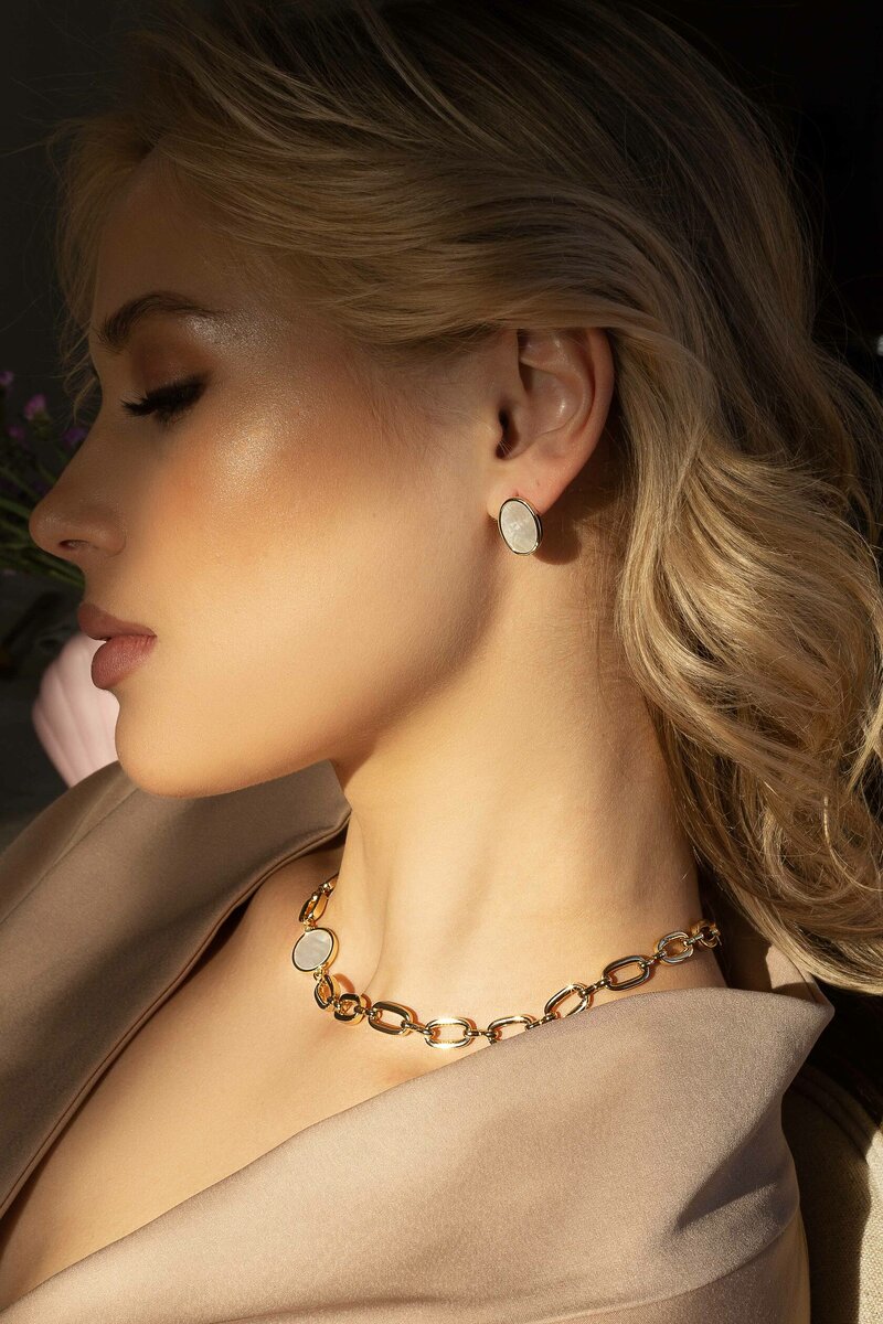 Серьги Sindy-Серьги овальной формы из латуни в позолоте 18К.-Вставки из натурального перламутра.-Английский замок.