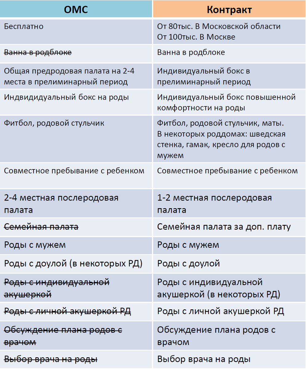 Давайте разбираться, какие плюсы и минусы у родов по контракту и без. Контракт с роддомом заключают в 36 недель, поэтому к этому сроку уже нужно определиться где и как вы хотите рожать. Итак, плюсы родов по ОМС: Теперь о минусах ОМС: А теперь о контрактных родах. Зачем нужен контракт и нужен ли он в принципе?! Существует несколько вариантов контрактных родов: 1. С дежурной бригадой. Здесь вижу смысл только если рожаете с доулой и хотите сэкономить на контракте с роддомом. 2. Контракт с личным врачом и дежурной акушеркой. 3. Личный врач+ доула и/или личная акушерка. Этот вариант считаю самым лучшим. Итак, плюсы контрактных родов: + Доктор учитывает ваши пожелания в родах. Например, если вы хотите родить максимально естественно, используя методы немедикаментозного обезболивания, чтобы пуповина пульсировала максимально долго, а не положенные 2 минуты. По ОМС это далеко не всегда возможно. И не потому что врач/акушерка плохие, а потому что поток. Очень большой поток рожениц в роддоме. +