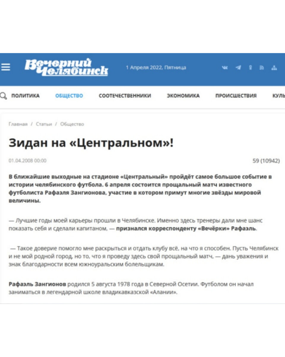 2008 год. Зидан на "Цетральном"!🏟 Именно с таким заголовком вышла статья в Вечернем Челябинске 📰 в 2008 году. Известный футболист Рафаэль Зангионов( Андерлехт 🇧🇪, Анжи🇷🇺, Алания 🇷🇺)6 апреля собирался провести прощальный матч, в котором сборная друзей Зангионова должна была схлестнутся против сборной Мира 🌏. С 2003 по 2006 Рафаэль был одним из лидеров челябинского Спартака🇷🇺, но команда развалилась и следующий сезон футболист провёл в Липецке, где был признан лучшим игроком зоны центр. Тем не менее провести прощальный матч решил в полюбившемся Челябинске. Составы команд впечатляли - команду друзей возглавил Гаджи Гаджиев 📢, а в составе были Заур Хапов 🇷🇺🧤, Владимир Габулов 🇷🇺, Александр Гацкан 🇲🇩 , Дмитрий Торбинский 🇷🇺 , Георгий и Джамбулад Базаевы 🇷🇺,Будун Будунов 🇷🇺, Вартан Мазалов 🇷🇺, Дмитрий Ананко 🇷🇺 , Альберт Осколков 🇷🇺, Ахрик Цвейба 🇷🇺, Артур Пагаев🇷🇺, Игорь Яновский 🇷🇺, Бахва Тедеев 🇷🇺, Тамерлан Варзиев 🇷🇺, Роберт Битаров 🇷🇺