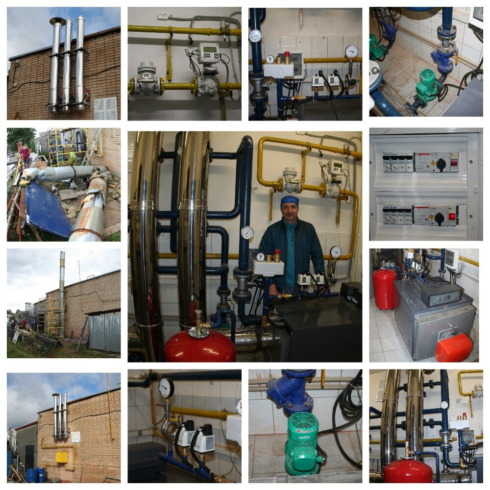 Жила-была котельная, по моим меркам без слёз не взглянешь)). Два чугунных котла по 100 квт каждый, вентиляторные горелки, без признаков настройки, обвязка, собранная "не приходя в сознание", сгнивший дымоход и полное отсутствие какой бы то ни было автоматизации. То есть котлы просто горели, а насосы просто крутились. Внешний вид дымохода. Он представлял из себя три жестяные трубы, обернутые стекловатой и заключенные в общий футляр из той же жести. Ну и вокруг, тоже помойка. Внутри, конечно, почище. Но это на первый взгляд. Вот бойлеры. Почему их два? А по тому, что одного не хватало, потребность в горячей воде велика и решили поставить второй. Но лучше не стало! А это гидроколлектор, сам коллектор сварили на месте, а смесительные группы Майбес. Я спросил: "а почему нет сервоприводов? как вы регулируете температуру подачи?" Мне ответил целый главный инженер: "Крутим руками...". Нда. А насосы просто подключены к боксу с автоматами. В общем, крайний примитив. В таких случаях не стоит цеп