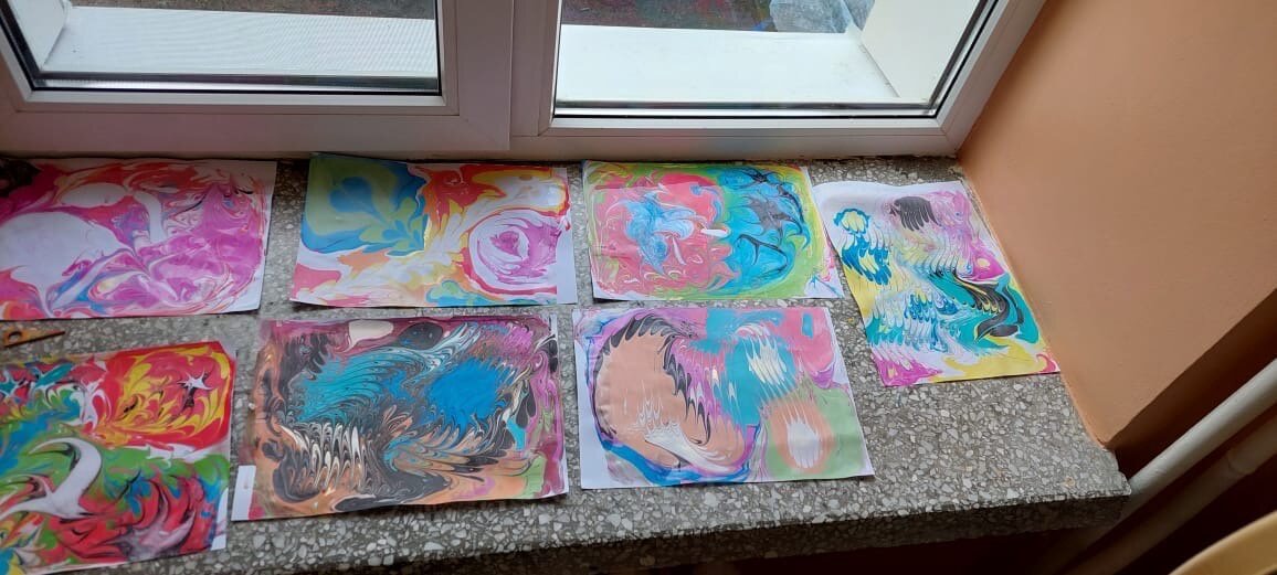 А сегодня на мастер-классе в Детской краевой клинической больнице города Краснодара мы рисовали с использованием любимой технике ЭБРУ. Эбру (в переводе — «воздушные облака») — техника рисования на поверхности воды с последующим переносом изображения на бумагу. Данная техника достаточно сложная в организации, но наши участники ее очень любят. Приоткроем занавес и расскажем вам как выглядит процесс создания таких красивых рисунков. ⃣ Подготовка жидкости Рисование Эбру начинается с подготовления жидкости. Желательно подобрать емкость площадью чуть больше рабочего листа (трафарета, холста) прямоугольной формы, на который позже будет переноситься рисунок. В нее и заливается подготовленный раствор. ⃣Нанесение рабочего фона Затем художник должен подготовить фон для рисунка. Его оформлению отводится особое место. Для этого берется определенная краска (возможно несколько оттенков), разбрызгивается каплями по поверхности. Затем с помощью палочек или специального инструмента, похожего на