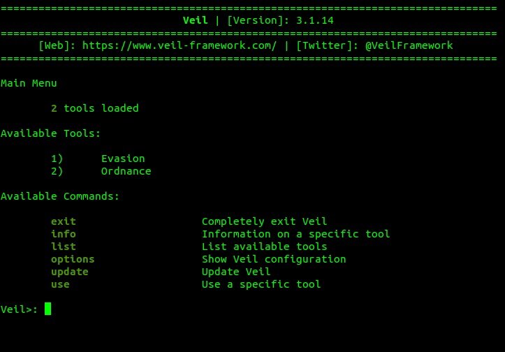 Фреймворк Veil состоит из двух инструментов Evasion и Ordinance, которые можно отобразить командой: