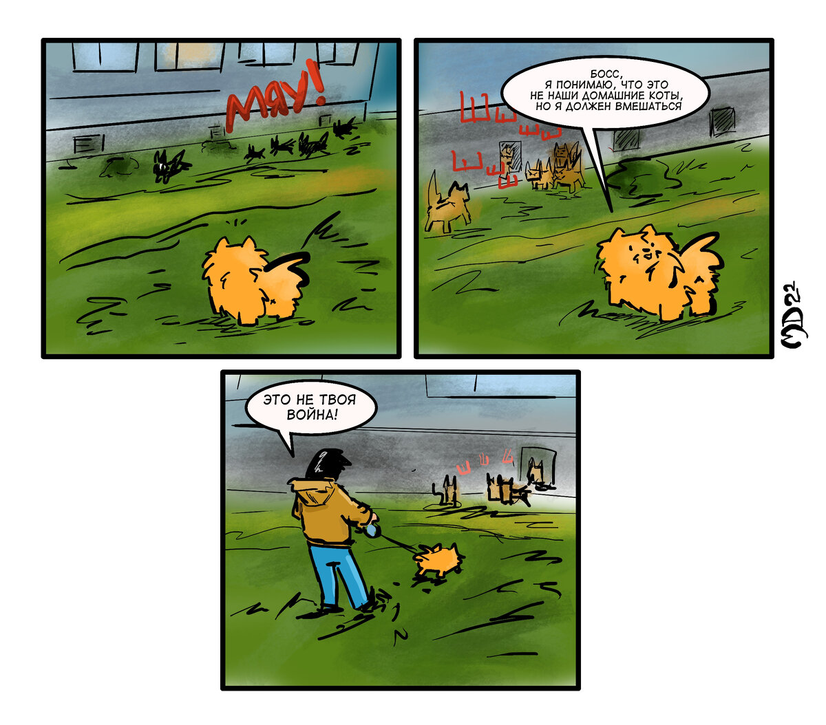 С нами живет несколько котов и у пса с ними отличные взаимоотношения... по крайней мере он так считает. Если бы он не был таким уж навязчивым, то наверняка не только он прекрасно бы проводил с ними время. Так или иначе он очень привыкший к котам, делиться с ними едой и гоняет в случае если те пытаются установить контроль над "его" комнатой, которую он должен сторожить, когда я ухожу на работу. Впрочем за взятку и из-за хороших взаимоотношений он спокойно пропускает их на мою кровать в мое отсутствие, показушно выгоняя только по моему возвращению. Он хороший друг для них, но всегда выполняет свою работу. Стоит только громко крикнуть кличку кота и вот уже лающий пушистый шар несется на поиски, чтобы загнать беднягу Фэт-кэта в угол. Именно поэтому псу всегда так хочется вмешаться в кошачьи потасовки на улице. Он воспринимает всех котов как хороших друзей, потому что не знает других с ними взаимоотношений, вот и старается влезть в любую такую "игру" по переделу территорий.