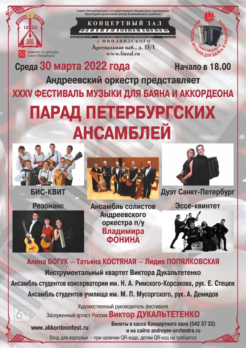 XXXV -й фестиваль музыки для баяна и аккордеона завершился в Концертном зале у Финляндского "ПАРАДОМ ПЕТЕРБУРГСКИХ АНСАМБЛЕЙ" Концерт, длившийся более 2-х часов, начался с небольшого анонса руководителя фестиваля Заслуженного артиста России Виктора Дукальтетенко, пообещавшего выступления не хуже, чем у Терем-квартета - прославленного ансамбля, недавно отметившего 35-летие. Виктор Дукальтетенко бессменный организатор фестиваля и этот 35-й фестиваль совпал с юбилеем организатора, полжизни отдавшего любимому делу.