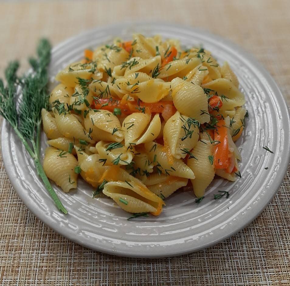 Когда надоел обычный гарнир из макарон - приготовьте макароны с овощами. Макароны по этому рецепту не нужно предварительно варить в кастрюльке - они готовятся одновременно с овощами на сковороде! Это лёгкий, сытный и вкусный ужин, который также подойдёт для вегетарианцев и постящихся! #пост Ингредиенты: Макароны любые (у меня ракушки) , Морковь , Лук , Перец болгарский (если сильно большой - можно ½ шт.), Масло подсолнечное , Вода (кипяток) , Соль, перец, специи Способ приготовления: Овощи почистить, помыть. Лук нарезать произвольно (кольцами, полукольцами, кубиками). Морковь натереть на крупной тёрке. Перец нарезать соломкой. В сковороде на среднем огне разогреть масло и выложить туда нарезанный лук. Обжарить в течение 3 - 4 минут, перемешивая. Добавить морковь к обжаренному луку, готовить ещё минуты 3. К овощам добавить нарезанный перец, перемешать и готовить еще минут 5. Всыпать сухие макароны. Влить воду, добавить соль, перец, специи, всё перемешать. Накрыть крышкой и готовит