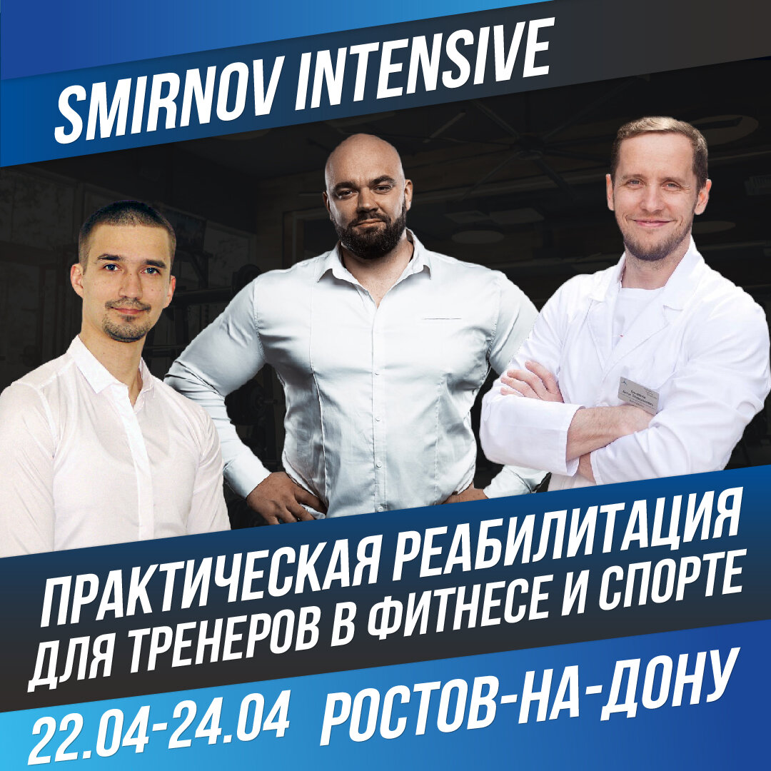 ▫️SMIRNOV INTENSIVE▫️ 22-24 апреля Ростов-на-Дону, ул.Герасименко,5 🔻Общая тема интенсива: "Практическая реабилитация для тренеров в фитнесе и спорте". 🔸Расписание: • 22.04 - Дмитрий Смирнов @coach_numero_uno Тема: Терапевтический эффект силовых упражнений. Теория и практика. • 23.04 - Павел Куделя @dr_kudelya Тема: Триггерные точки и техники активного релиза. Теория и практика. • 24.04 - Антон Епифанов @doktorepifanov Тема: Старение опорно двигательного аппарата в норме и при патологии. Теория и практика. ▪️Стоимость за 3 дня: 10 000₽ •Приобрести билеты можно на сайте, ссылка в шапке профиля• __________ #спорт #фитнес и здоровье #фитнес #пауэрлифтинг #бодибилдинг #йога #спортивные новости #фитнестренер #тренер