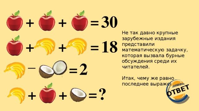 Итак, если вечером скучно дома, а детей надо чем-то увлечь, то садимся все рядком на диване и разгадываем вот такую загадку. Кстати, а как? Начинаем с яблок. Их три, а равны они 30. Делаем вывод, что одно яблоко равно 10! А дальше у нас одно яблоко и 8 бананов. В сумме они равны 18. Зная, что яблоко равно 10, делаем вывод, что восемь бананов равны 8. Идём далее: Теперь четыре банана и отнять кокос , состоящий из двух половинок. Четыре отнимаем 2, получаем 2. Теперь все складываем: три банана- это 3! Одно яблоко- это 10! и половинка кокоса- это 1! Подсчитываем: 3+10+1=14 Ответ готов! Интересно, а у вас так или иначе?
