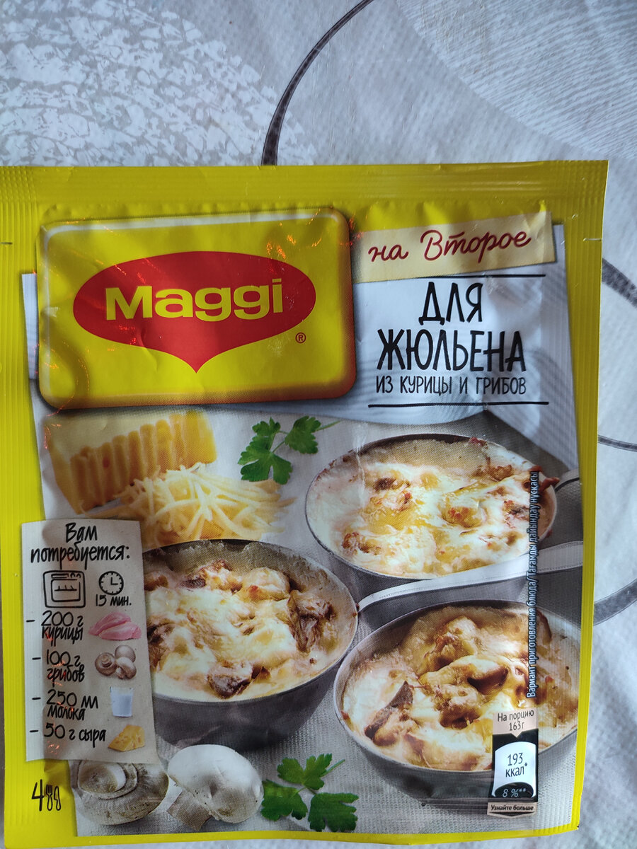 Сегодня на обед решила порадовать своих домочадцев Жюльеном. Как раз на днях нашла приправу от Maggi на второе "Для Жюльена из курицы и грибов" Перед началом прочтения статьи, хочу попросить вас подписаться и поставить 👍 это статье. Кроме самой приправы на потребуется: Замороженные грибы заранее достала из морозилки и выложила на сито, чтобы лишняя воды стекла. Когда грибы растают, ставлю 2 сковороды греться на плиту Курицу и грибы я буду жарить на разных сковородках, на сливочном масле. Когда грибочки обжарятся, добавляю их к курочке и тушу пару минут вместе. 250 миллилитров молока и готовую приправу от Maggi смешиваю вместе и полученную смесь выливаю в сковородку. Не прекращая помешивать, довожу до кипения и провариваю 1 минуту Натираю сыр на мелкой терке, лучше брать сыр 🧀, который хорошо плавится В одну большую форму выкладываю курочку с грибами, но в рецепте для выпекания использовать рекомендуют кокотницы, а так как у меня их нет, использую, что есть. Посыпав сыром, отпр