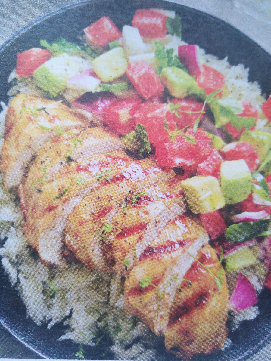 Ингредиенты : - 4 филе куриной грудки - 200 гр риса басмати - 80 мл соуса барбекю - 1 чайная ложка лимонного сока - 1 чайная ложка оливкового масла Для сальсы: - 1 авокадо - 1 красный апельсин - 1 апельсин - 1 красная луковица - 2-3 веточки кинзы - половина острого зелёного перца - соль, чёрный свежемолотый перец по вкусу 1. Обсушиваем филе курицы бумажными полотенцами, складываем в контейнер, поливаем соусом барбекю, переворачиваем несколько раз, чтобы соус распределился равномерно. Накрываем контейнер и убираем в холодильник на 4 часа. 2. Острым ножом срезаем кожуру с апельсинов, мякоть режем кубиками. Авокадо разрезаем вдоль пополам, удаляем косточку, снимаем кожуру, половинки нарезаем кубиками такого же размера, как и апельсины. Удаляем семена острого перца, стручок нарезаем тонкими ломтиками. Лук режем крупными кубиками и разбираем на слои. Соединяем овощи и апельсины, добавляем листики кинзы, солим и перемешиваем. Оставляем настояться 15 минут. 3. Всыпаем рис в сотейник с