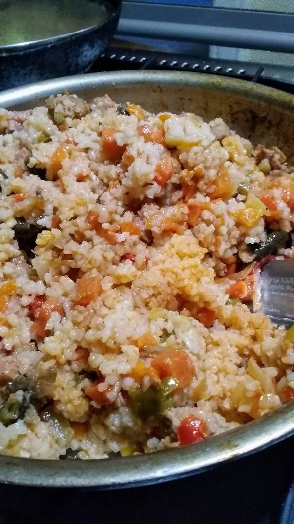 Высыпать промытый рис и распределить по поверхности овощей, посолить и добавить специи. Сверху налить воду, накрыть крышкой и томить на медленном огне до готовности риса. Затем перемешать и подавать к столу. Приятного аппетита. 😊