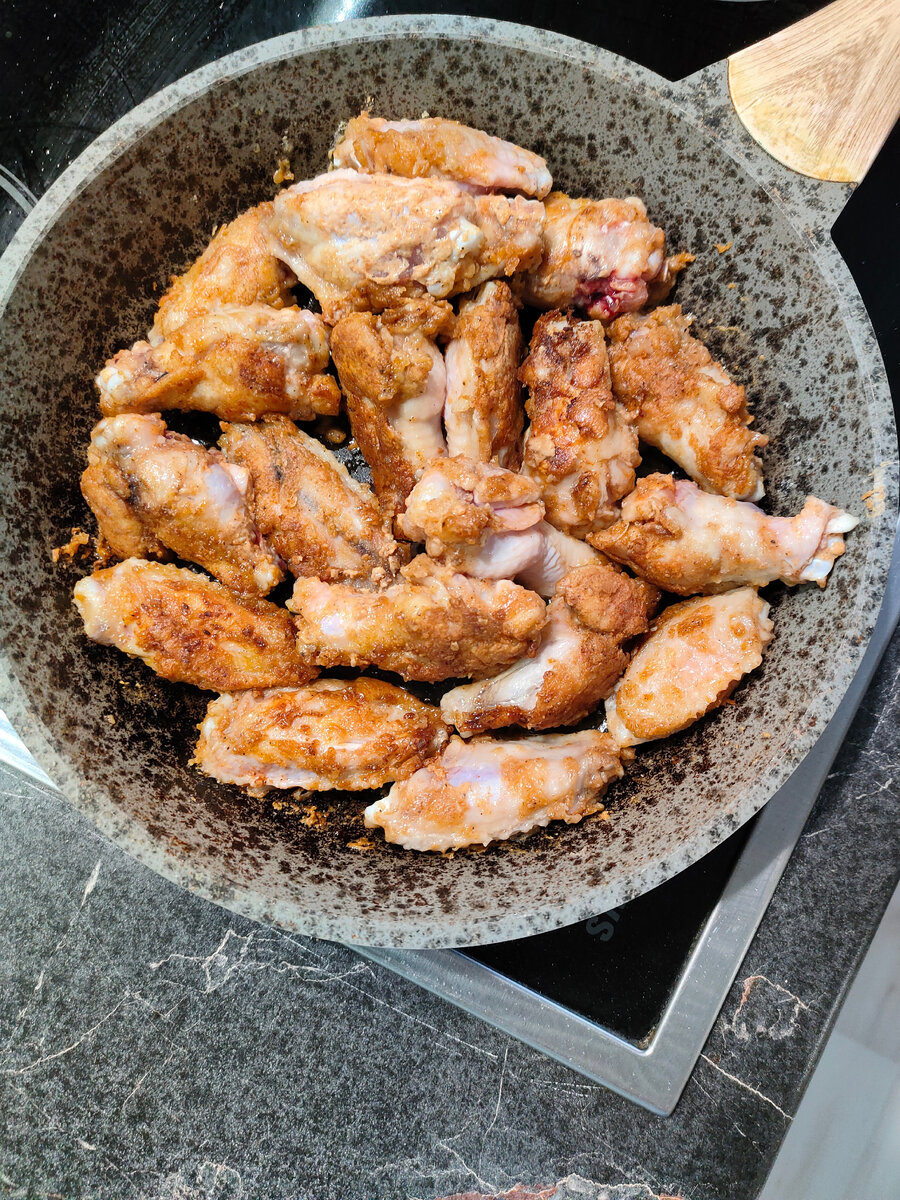 Всем привет!) Вечерок пятницы, а у нас крылышки барбекю 😜 Для приготовления берём лоток крыльев,разрезаем на 3 части, самую маленькую убираем,она не пригодится. Смешиваем 5 ст.л. муки, 1 ч.л. паприки( у меня копчёная), 1 ч.л. сухого чеснока,соль,перец по вкусу, обваливаем крылья и обжариваем на растительном масле 7-10 минут. Далее делаем соус- заправку: соус "Барбекю" + 1 ст.л.мёда, перемешиваем. Готовые крылья обмакиваем в соус и выкладываем на противень ( сковорода у меня) и отправляем в разогретую духовку на 30 минут. К крылышкам барбекю идеально подходят овощи. Всем приятного аппетита!!!😉😉😉