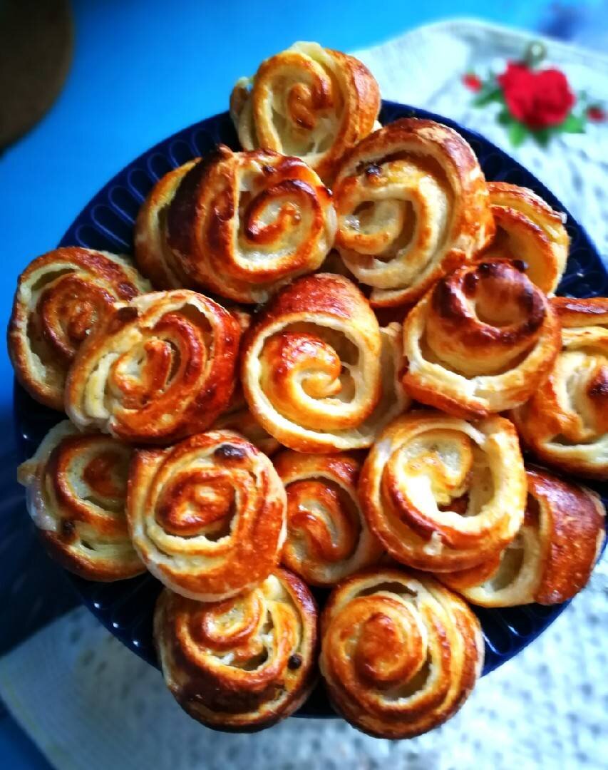 #булочки с заварным кремом и изюмом. #меню Слойка - это один из видов вкусных булочек, приготовленных из слоёного теста. В данном случае, это готовое (покупное) Дрожжевое Слоёное Тесто! А уж начинку, мы выбираем сами)) У меня сегодня заварной крем и изюм. Увидела в продаже такие булочки, и решила сама их исполнить)). С вдохновением помог @kislenko Александр, сам директор Cookpad )) Теперь и мой рецепт попадёт в редкое по названию в поиске блюдо "слойки с заварным кремом". Вкусная нежнятина получается. Все мои дегустаторы оценили высоко, хоть и с покупным тестом. Потому и готовятся быстро, что тесто уже готовое. Ингредиенты: - тесто слоёное дрожжевое, - изюм, Для Заварного Крема:, - молоко, - сахар, - желток яичный, - крахмал (или 1 ст.лож. крахмал + 1 ст.лож. мука), - ванилин Способ приготовления: Сначала приготовим Заварной крем, чтоб у него было время охладиться. Для этого молоко выливаем в сотейник, засыпаем сахар, размешиваем и ставим на медленный огонь. Затем тут же, добавляем 2 я