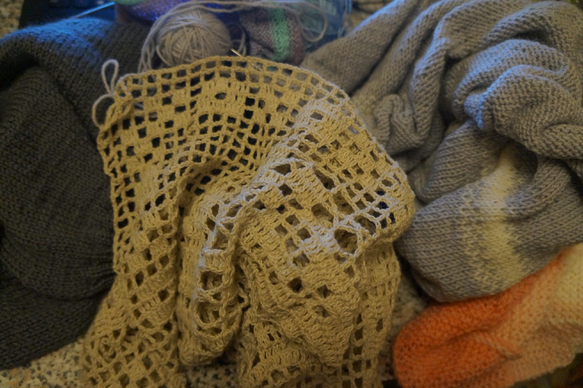 Ну что ж, решила я не ждать понедельника и начать уже сегодня разбираться со своим пряжным шопоголизмом и со своими запасами, и писать я решила об этом тоже сегодня. Разобрала я свои запасы, рассортировала, собрала все свои недовязы в количестве 6 штук. В кадр все не влезло, ибо много и все довольно объёмное. Вообще у меня есть манера начинать вязать два три проекта разом, вяжу день одно, день другое, что бы не надоедало. Не редко какие то вещи откладываются из за заказов, убираются в шкаф и я про них забываю на пару месяцев, а то и лет. Не знаю на сколько нормально начинать кучу вязаний с точки зрения психологии, но у меня как то так всё. Решила я начать со своих недовязов и довязть их все. Возможно, по мере довязывания одного изделия буду начинать что то ещё, не знаю, не решила ещё. Зато я определилась со сроками, пряжу решила не покупать до своего дня рождения, он у меня летом, в конце июля. Не факт, что я вывяжу всю пряжу за это время, но вряд ли смогу удержаться и не сделать себе