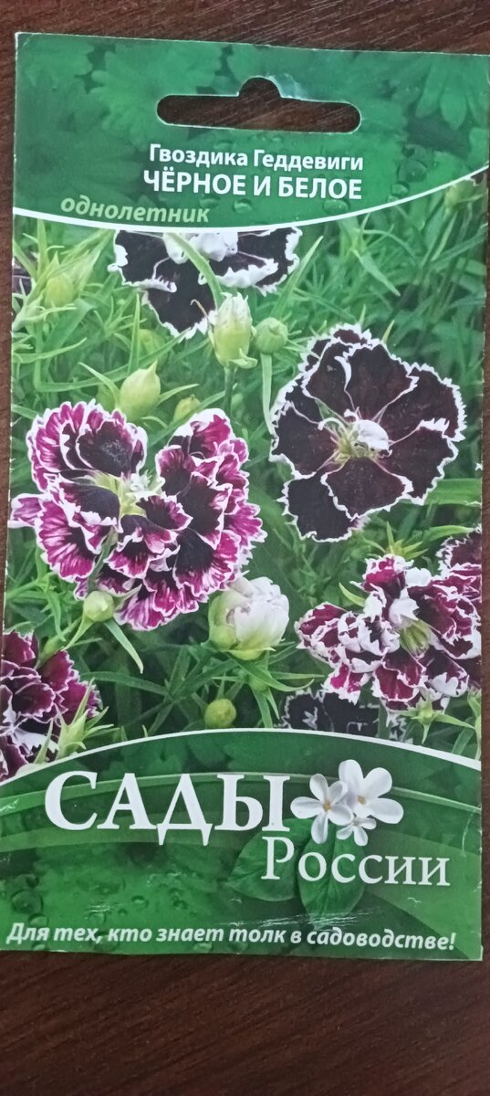 Я часто заказываю семена в интернет магазине САДЫ РОССИИ. Пролистывая каталог с яркими картинками, мне приглянулся необычный цветочек, это была гвоздика Геддевиги ЧЕРНОЕ и БЕЛОЕ. Я конечно нажала на кнопку купить и товар улетел в корзину. Прошла примерно неделя и моя долгожданная посылка прибыла ко мне с кучей разноцветных пакетиков, среди них была и гвоздика. Был январь месяц и я решила, что пора бы посеять эту красавицу на рассаду. Взошла она дружно и развивалась на глазах. В конце мая я высадила уже хорошо подросшие кустики гвоздики в открытый грунт. Радовала меня эта красавица до поздней осени. Цветы соответствовали описанию, они были крупные, махровые с контрастной окраской лепестков жгучих, до черноты, оттенков спелой вишни, с тонкой жемчужно-белой каймой по зубчатому краю и такой же белой изнанкой. НУ очень красивый цветочек!!!