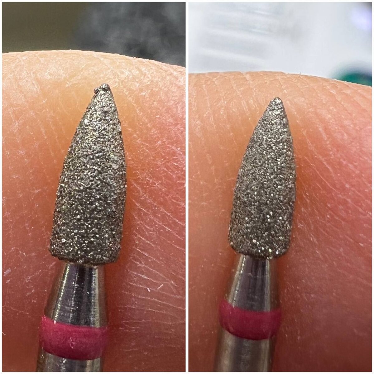 Ремонт фрезы! А такое возможно?🤔 В общем, статья для тех, кто по известным причинам не может посмотреть строис в одной из соц сетей. Это одна и та же Фреза, просто до и после - обратите внимание, что на фотографии слева на самом кончике алмазной фрезы маленькие ненужные кусочки. Если кто не знает, то алмазные фрезы создаются путем напыления этой алмазной, так называемой крошки и бывает заводской брак. Эту алмазную крошку напыляют неравномерно. Пылинки могут остаться на самом кончике, и они будут торчать такими песчинками. И эти песчинки могут дать пропил. То есть у вас техника может быть и правильная, и все может быть хорошо, но ногти будут пропилены просто, потому что вы не заметили эту маленькую штучку. Кстати, фрезу выкидывать не надо, особенно в наше непростое время. И эту самую песчинку мы можем просто банально спилить. Я для этого использовала такую же алмазную фрезу, но синяя насечка. Естественно не рабочей ее частью, а той, что ниже. Просто подравняла фрезу, и теперь она превр