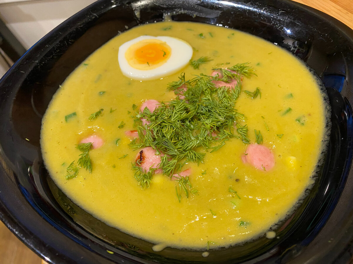 Подсматриваем и записываем за поварами. Рецепт супа был недавно опубликован на канале Василия Емельяненко. Все помнят советскую трапезу "горошек+сосиски", иногда с майонезом и (или) яйцом? Здесь используются те же самые продукты, только форма их другая. Несмотря на то, что блюдо ни фига не диетичное, мы его повторили. Муж заправляет консервированный горошек майонезом и ест вместе с отварными сосисками. Я люблю супы-пюре и яйца, но прохладно отношусь к консервам и мясным изделиям. кроме майонеза с черным хлебом, редко-редко😶🌫️. Точки соприкосновения найдены, пора приступать к воплощению рецепта. Короткое видео приготовления супа ниже⤵️ Итак, в кастрюле или сотейнике разогреваем 50 гр. сливочного масла и обжариваем мелко порезанную большую луковицу до прозрачности. Нарезаем сосиски колечками и слегка обжариваем в отдельной сковородке, тоже на сливочном масле. Для двух сосисок чайной ложки масла будет достаточно. Далее к луку выливаем банку горошка вместе с рассолом. Приправляем сол