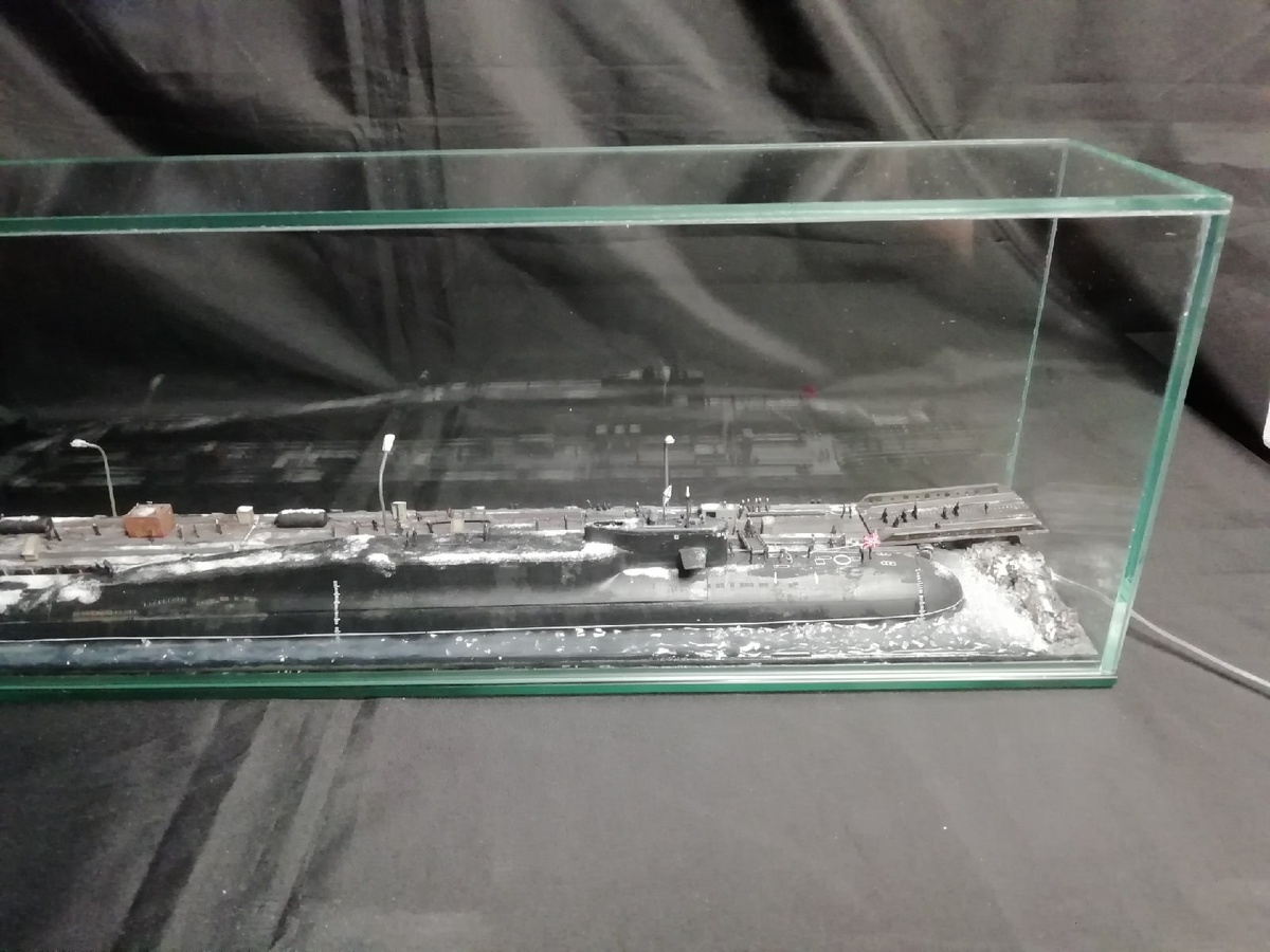 Модель стилизованная апл пр 667бдрм, у причала, зима, с подсветкой светодиодной, 12V.док, причал, вода полностью самодельные. Масштаб 1/350.материалы:стекло, пластик, дерево, краска, шпаклёвка. Размеры в см :дл 50см, выс-15см, шир. 10 см. Цена - в личку.модель есть в наличии. https://vk.com/album71922212_279918214