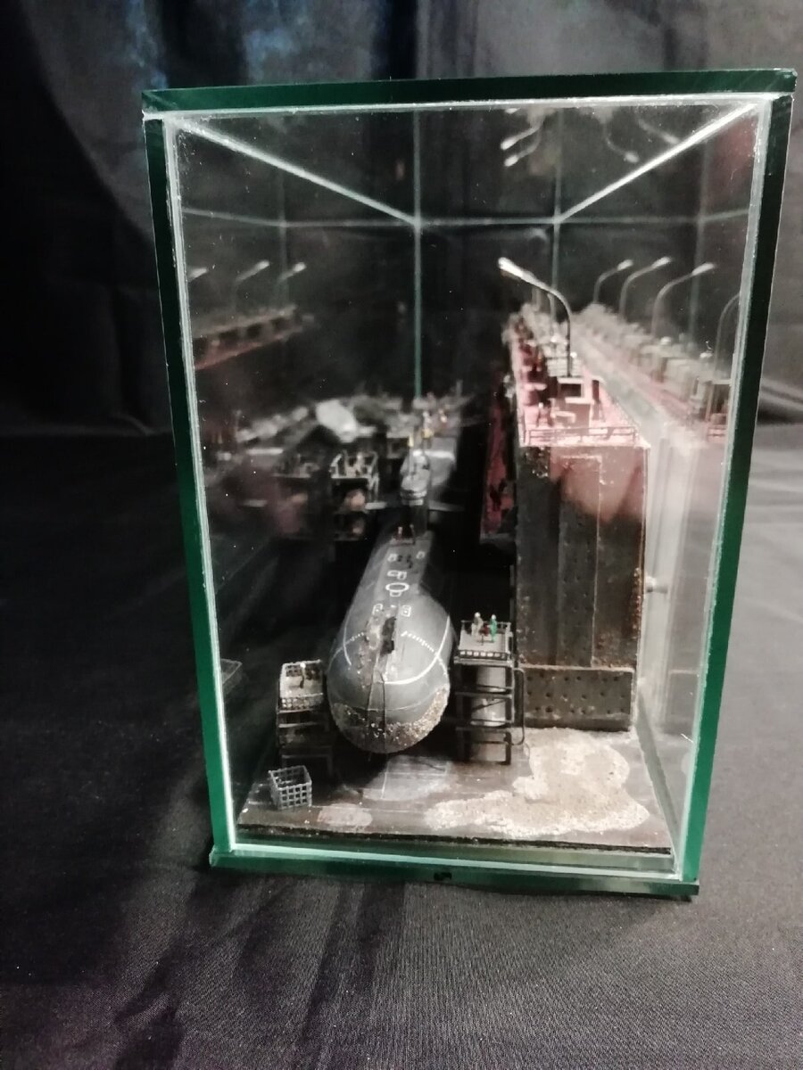 Модель стилизованная апл пр 667бдрм, в доке, с подсветкой светодиодной, 12V.док, стройлеса, доковый набор полностью самодельные. Масштаб 1/350.материалы:стекло, пластик, дерево, краска, шпаклёвка. Размеры в см :дл 50см, выс-15см, шир. 10 см. Цена - в личку.больше фото здесь:https://vk.com/album71922212_279917973