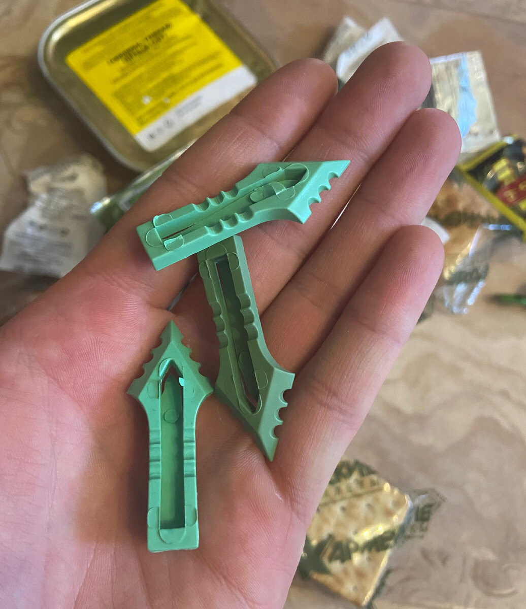 Наверняка многим из вас доводилось употреблять в пищу индивидуальный рацион питания (ИРП), очень выручает на рыбалках и вылазках на природу, так как экономит кучу времени на готовку и сборы. Не возникал ли у вас вопрос о предназначении пластмассового девайса в форме напоминающей наконечник стрелы? Мне он не давал покоя долгое время. Ведь изначально рацион питания предназначается для употребления его в экстремальных условиях, в частности людьми так или иначе связанных с военным делом. Соответственно его комплектующие должны приносить максимальную пользу и занимать минимальное количество места. Какая же польза у этого наконечника? Порывшись в интернете я не получил никакой информации по этому поводу. На обратной стороне сухпайка ФСИН РФ, в списке составляющих ничего подобного не обнаружено. Ладно, шутки шутками, у меня тоже были догадки, что это открывалка для консервов, но зачем она там, если все прекрасно открывается голыми руками за язычок. Делитесь в комментариях своим мнением об это