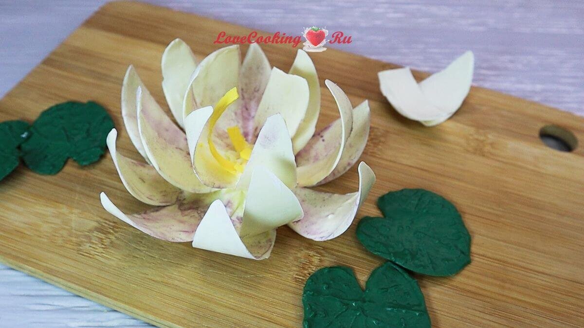 Я уже делала шоколадные цветы для торта, это другая вариация. Такой цветок из шоколада больше похож на лотос, но таким образом можно делать любые цветы, экспериментируя с шаблонами лепестков и сборкой. Этим цветком я декорировала черничный торт, рецепт здесь: Чернично-лимонный муссовый торт. Ещё один вариант шоколадных цветов можете посмотреть ЗДЕСЬ. Для изготовления шоколадного цветка понадобится: На 19 лепестков длиной 5-7 см, 4 листика: около 150 г белого шоколада можно использовать шоколадную глазурь в каллетах для более быстрой сборки я использую фризер ацетатная плёнка (можно использовать пергаментную бумагу) Пошаговое приготовление шоколадного цветка Из ацетатной плёнки вырезаем лепестки и листики нужной формы. Ацетатная плёнка у меня в рулоне, поэтому она подкручивается. Это сразу позволит формировать изогнутый лепесток. Можно использовать и пергаментную бумагу. Тогда, для изогнутого лепестка, нужно укладывать заготовки на какую-то полукруглую поверхность. Можно сделать "лодочк