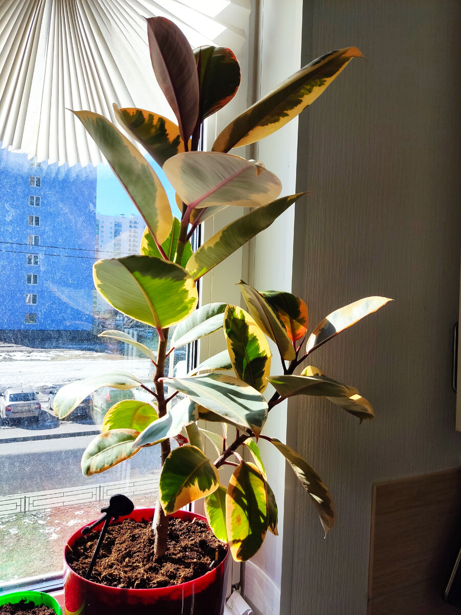 О, как замечателен это крупнолистный, пёстрый красавец на подоконнике. Многие боятся формировать его крону, так как ветки такого фикуса толстые, мясистые. А листья имеют дивную форму и цвет. И взять в руки инструмент и вот так просто укоротить красавца не у каждого рука подымется. Свой фикусов я обрезала уже несколько раз и всякий раз с большой опаской (вдруг что не так) . Просто, если не сделать вовремя обрезку то ближе к вершине молодые ветки утолщаются, крона искривляется и становится однобокой. И вот наступила весна. Появились новые веточки. Новые листики стали раскрываться всё чаще. А значит лучшее время для обрезки формирования. И так возьму в руки острый и чистый концелярский нож. И аккуратно обрежу не одревесневевшую зелёную ветку сантиметров 25. Потом промываю млечный сок (если его не смыть, он мешает образованию корней) и обязательно убрать сок (например сухой салфеткой) на материнском растении иначе на ветке будет что то в виде неаккуратного шрама. И для верности обр