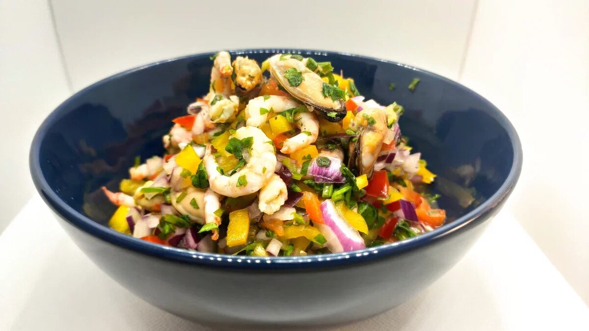 Доброго времени суток лучшие в мире подписчики. Сегодня подготовили для вас крутейший рецепт салата с морепродуктами, который прекрасно подходит к бокальчику пенного, и обязательно порадует вас и ваших гостей. Ингредиенты: 1. Креветки (варено мороженные) – 0,5 кг. 2. Мидии (варено мороженные) – 0,4-0,5 кг. 3. Красный репчатый лук – 2 средние луковицы. 4. Сладкий перец – 3 шт (лучше взять разных цветов, для красоты) 5. Лимон – 2 шт. 6. Кинза – 50-70 гр. 7. Соус Табаско - 1-2 ч. ложки (в зависимости от любви к острому J) 8. Сахарный песок – 1 ст. ложка (без горки) 9. Соль, перец – по вкусу. Приготовление: Креветки и мидии размораживаем и очищаем от лишнего (креветки от панциря, мидии от травы) и складываем в глубокую емкость. Репчатый лук и сладкий перец чистим, и режим мелким кубиком затем отправляем к креветкам и мидиям. Кинза – нарезаем листья и половину стеблей, так же отправляем в емкость. Далее заправляем салат специями и ставим его в холодильник на 2-3 часа, что бы все ингре