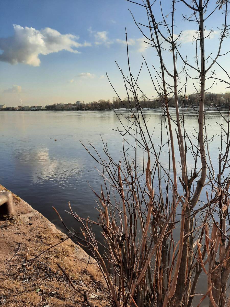 Да, да, если я Вам 30 марта показывала Неву всю во льду, то вот сейчас Вы видите водную гладь реки. Правда, если честно, то там , где был лёд , он и сейчас есть. Просто здесь река делает поворот и получился затор. А выше по течению Невы, куда я ушла в этот раз, уже чистая вода. И так приятно на это смотреть! Вот уж точно не зима. Хоть и холодно не по весеннему. Зато солнце яркое радует. И небо синее. Я далеко ушла и река всё время была безо льда. Только у берега кое-где были льдины. Я спускалась вниз по ступеням к самой воде- смотрела на воду . Видела чаек, пыталась их фотографировать, но они улетали. Фотографировала противоположный берег против солнца. Получилось интересно -будто уже темнеет. А ещё видела, что моют пешеходные переходы на проезжей части набережной. Значит город начали мыть и убирать , как обещали с 1 апреля. На обратном пути опять пришла ко льдам. И снова утками любовалась, как и два дня назад. Закат в этот раз намечался совершенно другой, чем два дня н