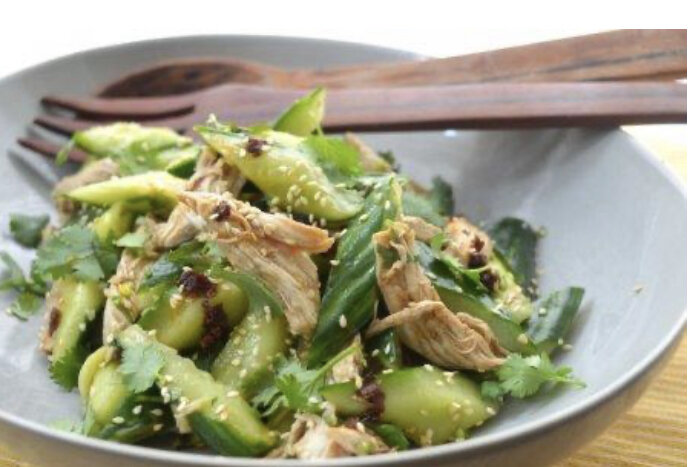 Салат с курицей и огурцами. Ингредиенты: куриная грудка- 300 г. сыр твердый- 50 г. огурец свежий- 2 шт. средние. лимонный сок- 1 ч.л. соевый соус- 4 ч.л. Приготовление: Салат с курицей, перцем и корейской морковью. Ингредиенты: курица- 400 г. корейская морковь- 300г. перец болгарский- 1 шт. майонез- 60 г. сухарики- 50 г. Приготовление: Салат с пекинской капустой и курицей. Ингредиенты: пекинская капуста- 500 г. кукуруза консервированная- 250 г. огурец средний- 1 шт. перец болгарский- 1 шт. помидор- 1 шт. курица- 200г. сметана- 100 г. соль и перец- по вкусу. горчица- 5-10 г. Приготовление: