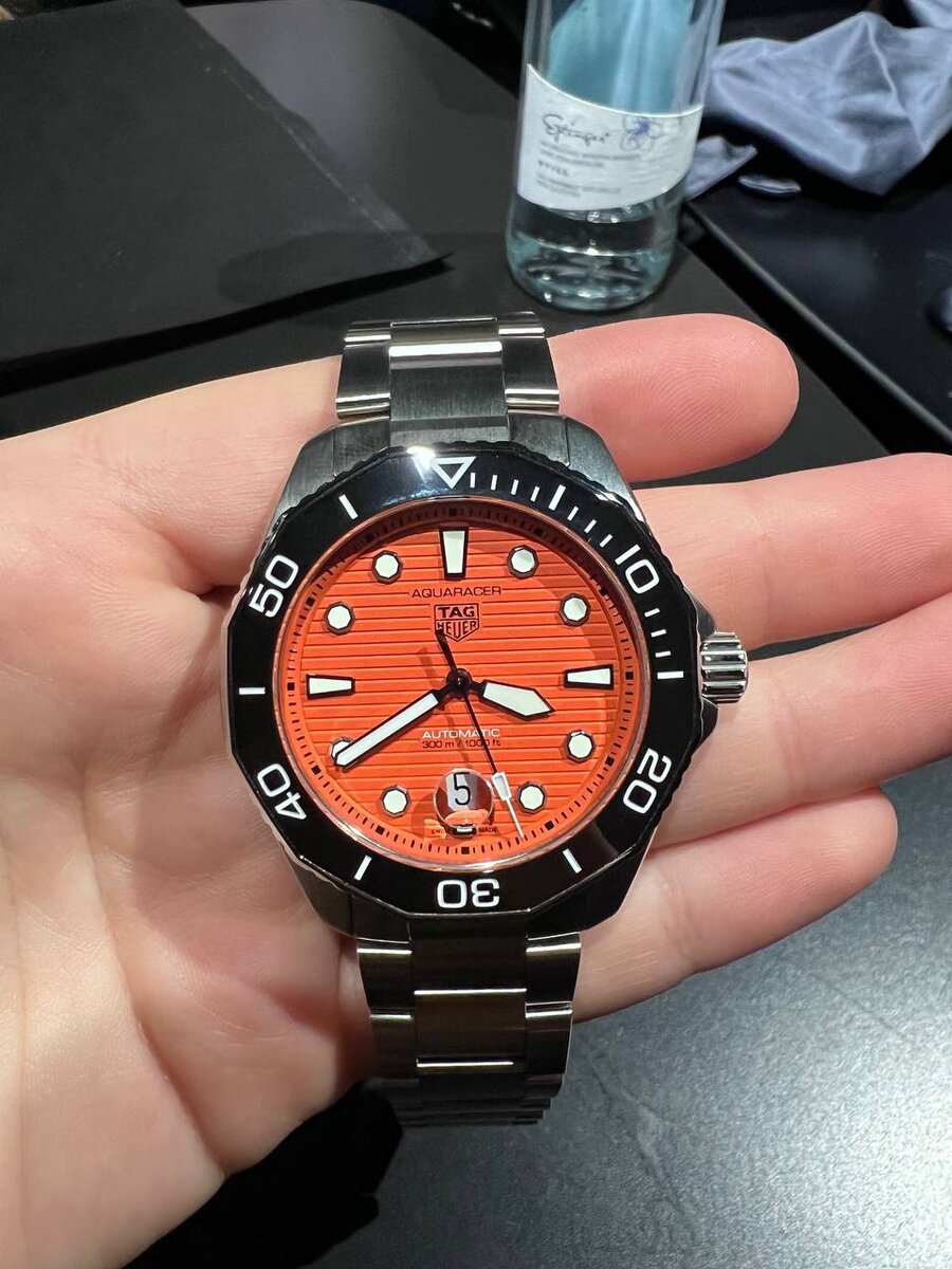 Новый любительский дайвер TAG Heuer Aquaracer в 43-миллиметровом корпусе из стали с очень ярким оранжевым циферблатом. Погружаться можно на глубину до 300 метров. В продаже уже в мае.