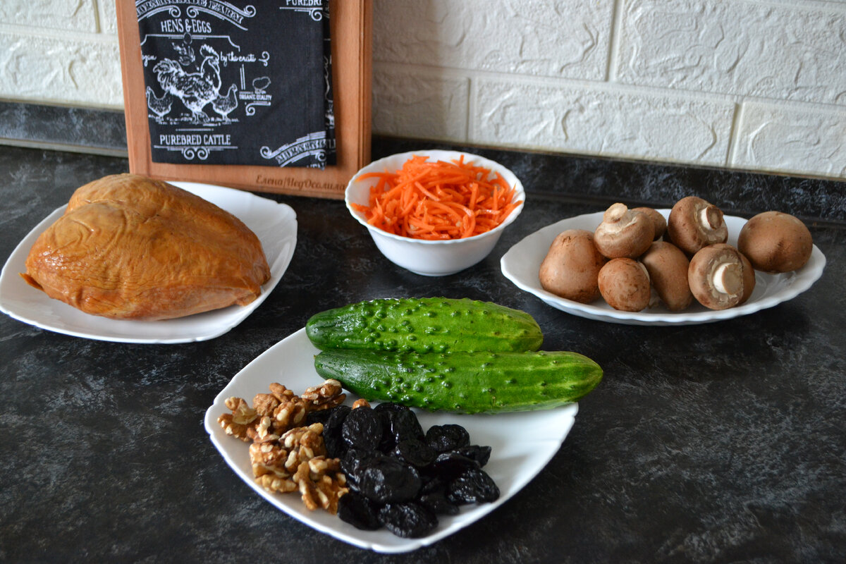 Всем привет! На днях у нас на работе был девичник пятничный :), много на столе было разных вкусностей, нарезка разная, пироги с картофелем и мясом, девочки ведь все же как никак собрались и еще был один салатик , он у нас очень быстро разошелся по тарелкам, потому как вкусный очень был. Не постесняясь узнала рецепт и приготовила дома для своих... Продукты: Шампиньоны - 300 грамм Куриная грудка - 200 грамм Морковь-по корейски - 200-250 грамм Огурец свежий - 2 штуки Чернослив - 50-70 грамм Грецкие орехи - 30-50 грамм Майонез -3 ст.ложки Листайте фото :) Итак, собираем салат: 1 слой куриная грудка, 2 слой сеточка майонеза 3 слой морковь по-корейски 4 слой чернослив и жареные шампиньоны 5 слой сеточка майонеза завершающий слой огурец и грецкие орехи. по желанию слои можно повторить. Приятного аппетита! Готовьте с удовольствием! Буду рада если Вам понравилась статья, ставьте лайк, делитесь с друзьями в соц.сетях и не забудьте подписаться на канал, впереди вас ждет много интересного. Всем