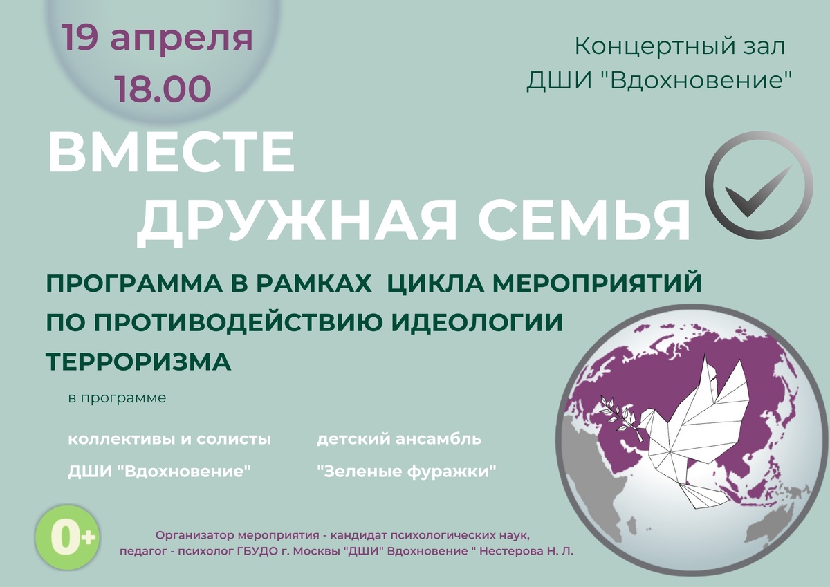 ДШИ «Вдохновение» в течении учебного года проводит цикл мероприятий по противодействию идеологии терроризма. Завершающим мероприятием в 2021-2022 учебном году станет программа «Вместе дружная семья». 19 апреля в 18.00 мы ждем Вас в концертном зале ДШИ "Вдохновение". В программе выступления солистов и творческих коллективов нашей школы, а также выступление долгожданных гостей - детского ансамбля «Зеленые фуражки». Коллектив «Зеленые фуражки» - детский ансамбль при Центральном пограничном ансамбле ФСБ России. Организатор мероприятия - кандидат психологических наук, педагог - психолог ГБУДО г. Москвы "ДШИ "Вдохновение" Нестерова Надежда Леонидовна. #дшивдохновение #дши #мши #московскиешколыискусств