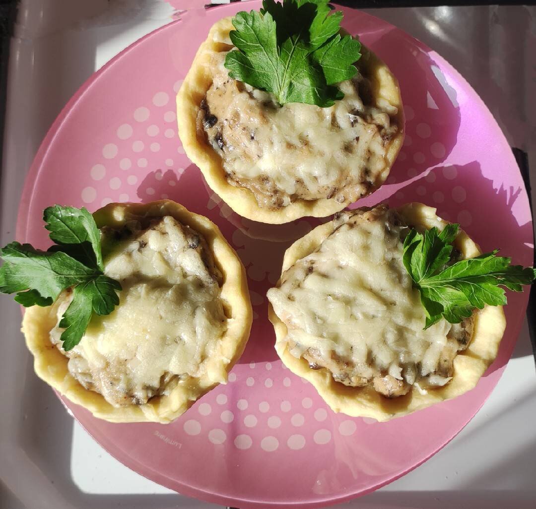 Жюльен — это популярное французское, горячее блюдо, которое известно уже по всему миру. Жюльен в переводе с французского означает «метод нарезки молодых овощей». Но в современных представлениях, это блюдо с добавлением сыра, грибов и куриного филе. Большой популярностью пользуется именно это блюдо у современных хозяек. Ведь готовить его не составит особого труда. К тому же, оно всегда получается аппетитным и сочным. Ещё одним плюсом, приготовление жульена, является минимум ингредиентов и возможность менять структуру приготовления. #пост Ингредиенты: Мука, Разрыхлитель, Оливковое масло, Соль, Вода теплая , Шампиньоны свежие, Лук, Сливки , Сметана , Растительное масло, Мука, Соль , Петрушка, Сыр Способ приготовления: Замесить тесто для корзиночки: смешать муку, разрыхлитель, соль, оливковое масло и воду. Дать отдохнуть минут 10. Разделить на 4 части и раскатать в небольшие кружочки. Формочку для запекания перевернуть дном вверх, накрыть кружочками теста. Отправить в духовку на 10-12 мину