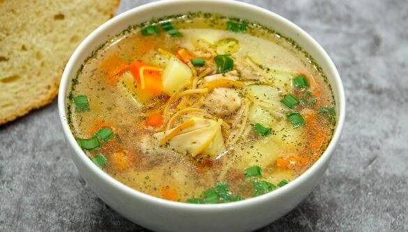 Предлагаю вам рецептик вкусного супа. Наткнулся на него случайно. И скажу прямо сомневался. Но приготовил и .... Зашло. Продукты (на 5 порций) Курица (окорочок) - 450 г Картофель - 350 г Морковь - 100 г Лук репчатый - 100 г Вермишель тонкая - 70 г Лавровый лист - 2-3 шт. Перец душистый горошком - 7 шт. Зелень петрушки - 10 г Укроп сушёный - 2/3 ч. ложки Соль - по вкусу Перец чёрный молотый - по вкусу Вода - 1,8 л Способ приготовления: Куриное мясо заливаем водой (1,8 л) и ставим на огонь.После закипания снимаем пену.Лук и морковь очищаем и добавляем в кастрюлю. Туда же отправляем лавровый лист и душистый перец. Варим бульон на маленьком огне 40 минут. Разогреваем сковороду и высыпаем туда вермишель. Обжариваем, постоянно помешивая, 3-5 минут, до золотистого оттенка. Картофель очищаем и нарезаем небольшими кубиками. Из кастрюли вынимаем куриное мясо и морковь. Бульон процеживаем. Лавровый лист, лук и душистый перец выбрасываем - они больше не понадобятся.