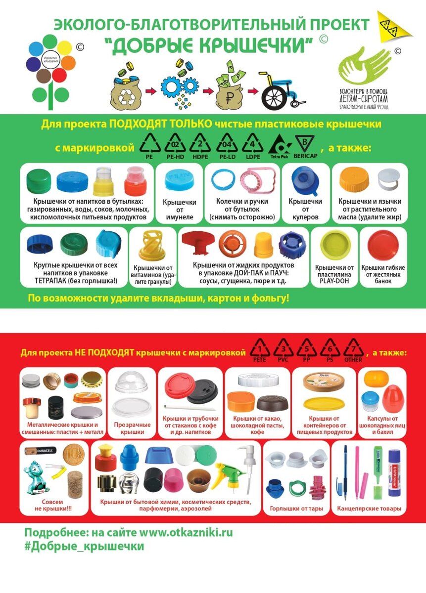 Задумывались ли вы о переработке таких маленьких и распространённых крышечек? Они встречаются везде. И их можно сдавать на переработку отдельно. Но не все крышечки являются «добрыми» и приносят пользу. Разбираемся. Существует благотворительный проект «добрые крышечки» Это российский эколого-благотворительный волонтерский проект, имеющий двойную цель: сделать наш мир чище и помочь детям, которым нужна поддержка. Проект организован совместно Общественным движением «ДОБРЫЕ КРЫШЕЧКИ» и Благотворительным фондом «Волонтеры в помощь детям-сиротам». Они собирают пластиковые завинчивающиеся крышечки от питьевой тары. Крупную партию отправляют на завод по переработке пластика. Завод взвешивает сырье и переводит денежные средства за собранные крышечки. Далее фонд финансово помогает проекту «близкие люди» - детям с особенностями развития. За время существования проекта уже помогли 61 ребёнку в покупке необходимого инвентаря в разных районах России. Отчеты фонд публикует открыто на сайте.