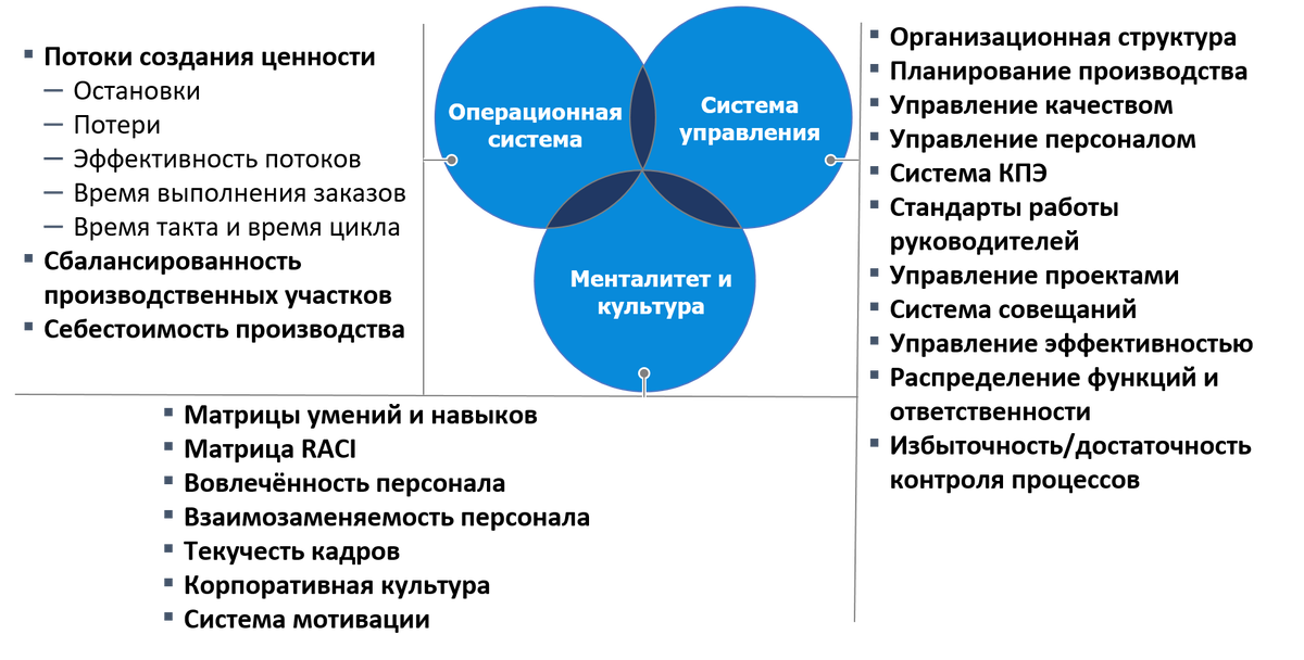 На сегодняшний день уже не осталось более или менее значительных компаний, которые бы не занимались работой по повышению эффективности своего бизнеса. Оно и понятно: бизнес существует в конкурентной среде, и, если вы свою эффективность не повышаете, то ваши конкуренты это делают, а в этом случае, у вашей компании нет шансов просуществовать долго. Сама последовательность действий и применения инструментов при реализации программ повышения эффективности описывается в специальных учебных курсах Университета Лин Шесть Сигм, таких как «Чёрный пояс Лин Шесть Сигм» и «Навигатор изменений». В этой статье важно подчеркнуть, что, обобщая опыт компаний из разных стран и различных отраслей, мы можем сделать вывод, что выстраивание долгосрочной деятельности по повышению эффективности и обеспечение устойчивых изменений возможно только, если мы работаем над улучшением трёх блоков, из которых состоит система непрерывных улучшений: Операционная система, Система управления и Менталитет и культура. Поня