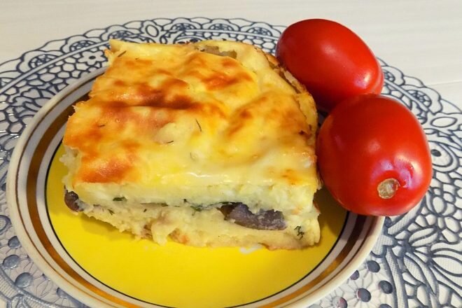 Представляю Вам мой простой рецепт приготовления картофельной запеканки с грибами. Эта вкусная и сытная запеканка готовится из картофельного пюре в духовке. Попробуйте приготовить, я думаю она понравиться Вам и Вашим близким Ингредиенты Приготовление: 1 час 25 минут ШАГ 1 Картофель чистим и варим его до готовности. Сливаем воду, добавляем небольшой кусочек сливочного масла и солим по своему вкусу. Разминаем вареный картофель в пюре. Добавляем в пюре 4 куриных яйца и хорошо перемешаем. ШАГ 2 Нарежем репчатый лук. Свежие грибы нарезаем небольшими кусочками произвольной форму. В сковороду наливаем немного растительного масла и жарим грибы с луком до готовности, солим жареные грибы по своему вкусу. ШАГ 3 Свежий укроп мелко нарезаем. А плавленый сырок натираем на крупной терке в отдельную миску. ШАГ 4 Теперь смажем растительным маслом форму для выпечки, у меня прямоугольная форма 20 на 30 сантиметров. ШАГ 5 Половину картофельного пюре выложим в смазанную форму разровняв его. В оставшуюся по