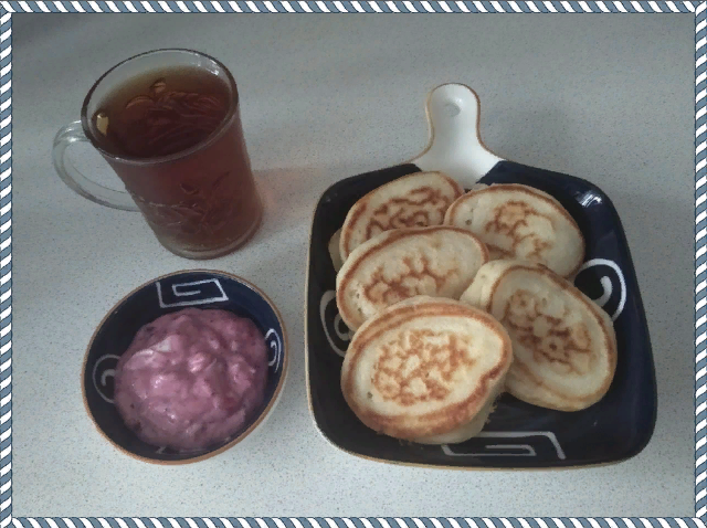 Ещё с вечера я грезила оладушками))) Настоящими, из нормальной муки) Нажарила на один разок, высчитав ингредиенты из проверенного мною рецепта. По итогу получилось пять больших оладий, но вместе с соусом все равно очень мало калорий - всего 296.