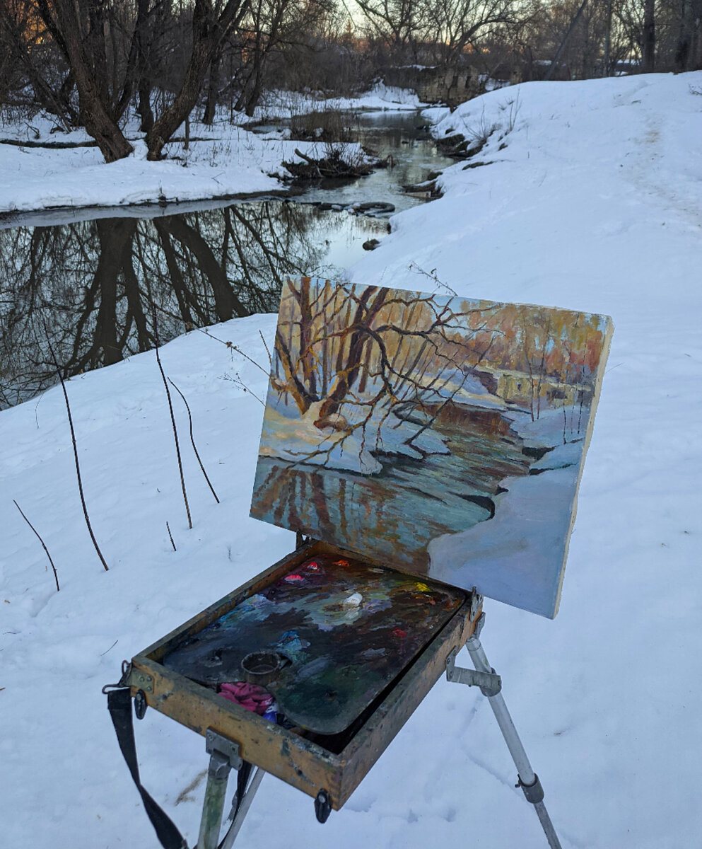 Данной статьёй я не просто хочу рассказать о создании конкретной картины, я хочу показать вам, что кухня профессионального художника намного сложнее, чем просто "нарисовал и выставил в интернет". Данную работу начал делать весной 2018 года. Из-за того, что вечернее солнце быстро убегало, приходилось несколько раз приезжать на мотив, но в итоге так и не успел её тогда завершить. Довольно часто я доделываю работы в мастерской, но этот мотив был сложен по многим аспектам, поэтому я просто решил отложить его на год. В результате получилось, что нужного состояния, того, что было в 2018 я дождался лишь спустя 4 года. И вот, после проведения практически "хирургической операции" над картиной для воскрешения восприимчивости старого слоя краски к новому, я отправился на то самое место и уже, набравшись опыта за последние 4 года, завершил пейзаж!