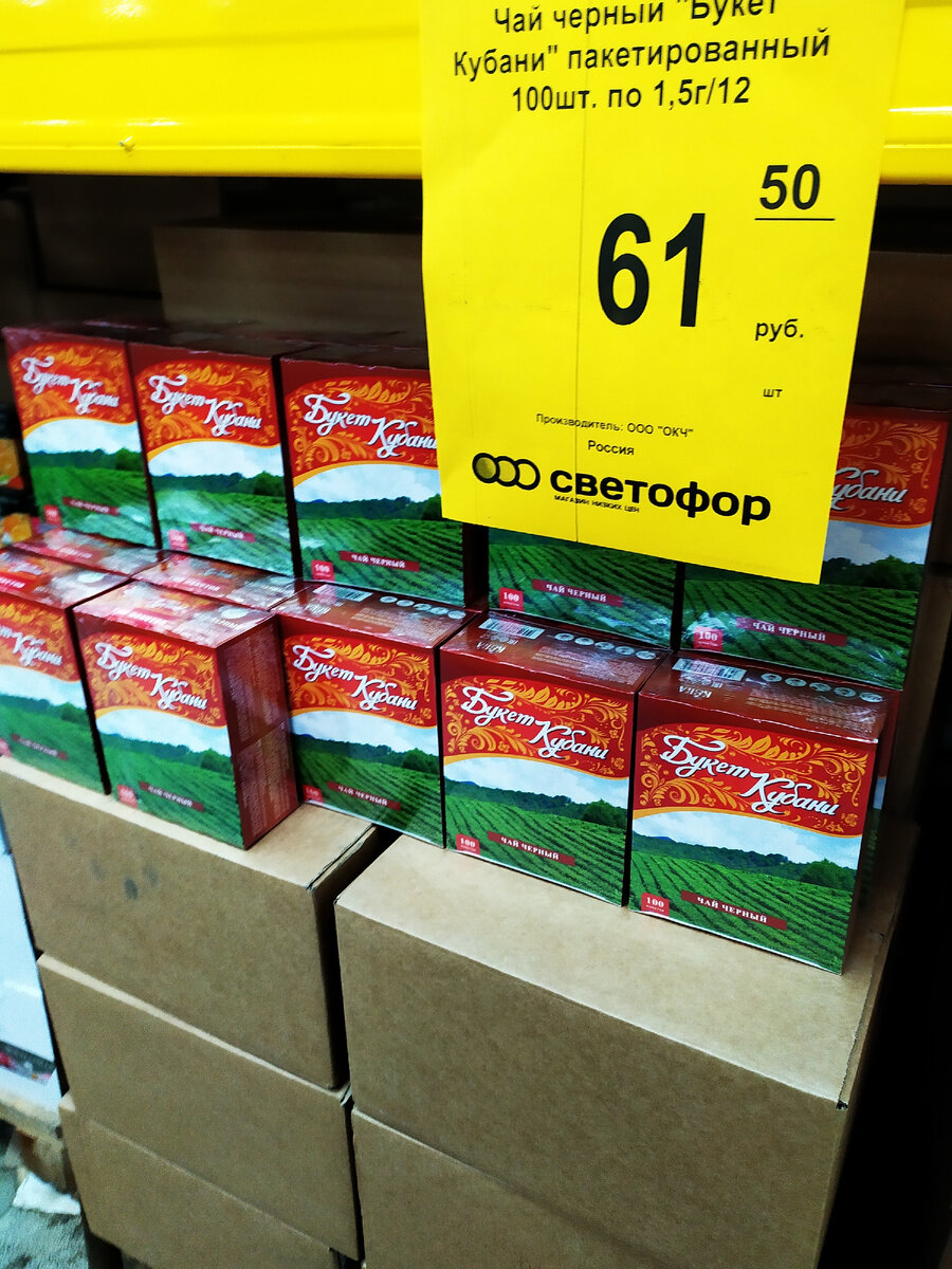 Все покупатели "Светофора" отмечают, что в "Светофоре" постоянное сдерживание цен и даже бывают скидки на некоторые товары, особенно на заморозку. И в этом обзоре я хочу поделиться с вами увиденным на полках "Светофора" в городе Новороссийск. Чёрный чай "Букет Кубани", в упаковке 100 пакетиков по 1,5 грамма. Цена 61 рубль. Ягодный и цитрусовый чай SUN TEA HILLS, в упаковке 20 пирамидок по 1,7 грамма. Цена 33 рубля. В ведёрке цветочный мёд "Своя пасека", массой 1 кг. Цена 163 рубля. Консервы с тушёной говядиной, массой 338 грамм. Цена 81 рубль. В небольшой стеклянной банке растворимый напиток RICH D`OR, массой 115 грамм. Цена 107 рублей. Консервы с зелёным горошком ГОСТ, массой 420 грамм. Цена 31 рубль. Маринованные грибы ассорти Botanica, массо 580 грамм. Цена 110 рублей. В стекле маринованные томаты "Черри", массой 680 грамм. Цена 64 рубля. Консервы с резанными шампиньонами из Китая на 850 мл. Цена 96 рублей. Охлаждённая свинина на кости со шкурой. Цена 200 рублей за 1 кг. Мороженая т