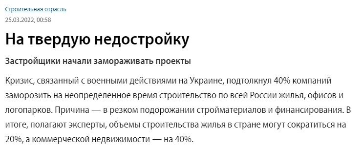 Начавшийся финансовый кризис в полной мере затронул и строительную отрасль. Как утверждает газета "Коммерсант", по состоянию на конец марта 40% российских застройщиков заморозили проекты по строительству жилых домов и коммерческой недвижимости. Эти данные подсчитали в межотраслевой ассоциации саморегуляторов в области строительства и проектирования «Синергия», опросившей около 1 тыс. строительных и проектных компаний по всей России. Основных причин такой ситуации две: 1. Резкое подорожание стройматериалов (80-200% за март) и разрыв логистических цепочек по их доставке (многие стройматериалы доставлялись из Европы). 2. Резкое подорожание финансирования (как правило, все строительство ведется за счет банковских кредитов, а их цена выросла в 2,5-3 раза). По этим причинам 40% компаний заморозили отдельные объекты строительства, и еще 29% отложили недавно начатые проекты, перекинув все силы на завершение уже почти построенных. В частности, о замораживании объектов строительства уже объявили
