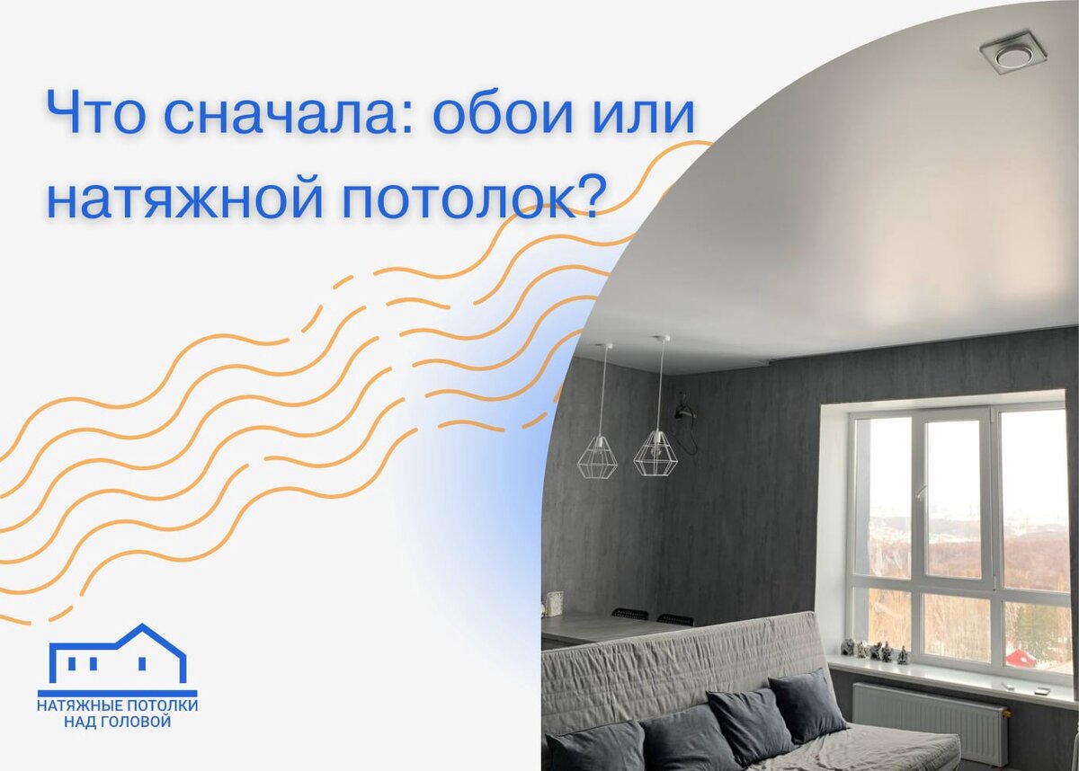 Задаваясь этим вопросом, мнения мастеров расходятся. Одни из них предпочитают сначала делать натяжной потолок, а другие считают правильным прежде всего поклеить обои. В обоих случаях есть риск повредить как обои, так и потолочное полотно. Наша компания натяжных потолков «Над головой» всегда рекомендует БЕСПЛАТНО вызвать замерщика, который, увидев помещение, скажет, что лучше делать в первую очередь ;) Для лучшего понимания, рассмотрим оба случая: В данном варианте мастера считают более вероятным повредить натяжной потолок при поклейке обоев, или испачкать полотно краской, при окрашивании стен. Однако есть возможность испортить обои, если монтаж производят не профессионалы Но это можно избежать, если: - работать со специальным перфоратором с пылесборником. Благодаря ему вероятность распространения пыли минимальна. Наша компания использует именно такой перфоратор; - производить монтаж натяжных потолков только тогда, когда обои полностью высохли (как минимум 4-5 дней). Это необходимо для