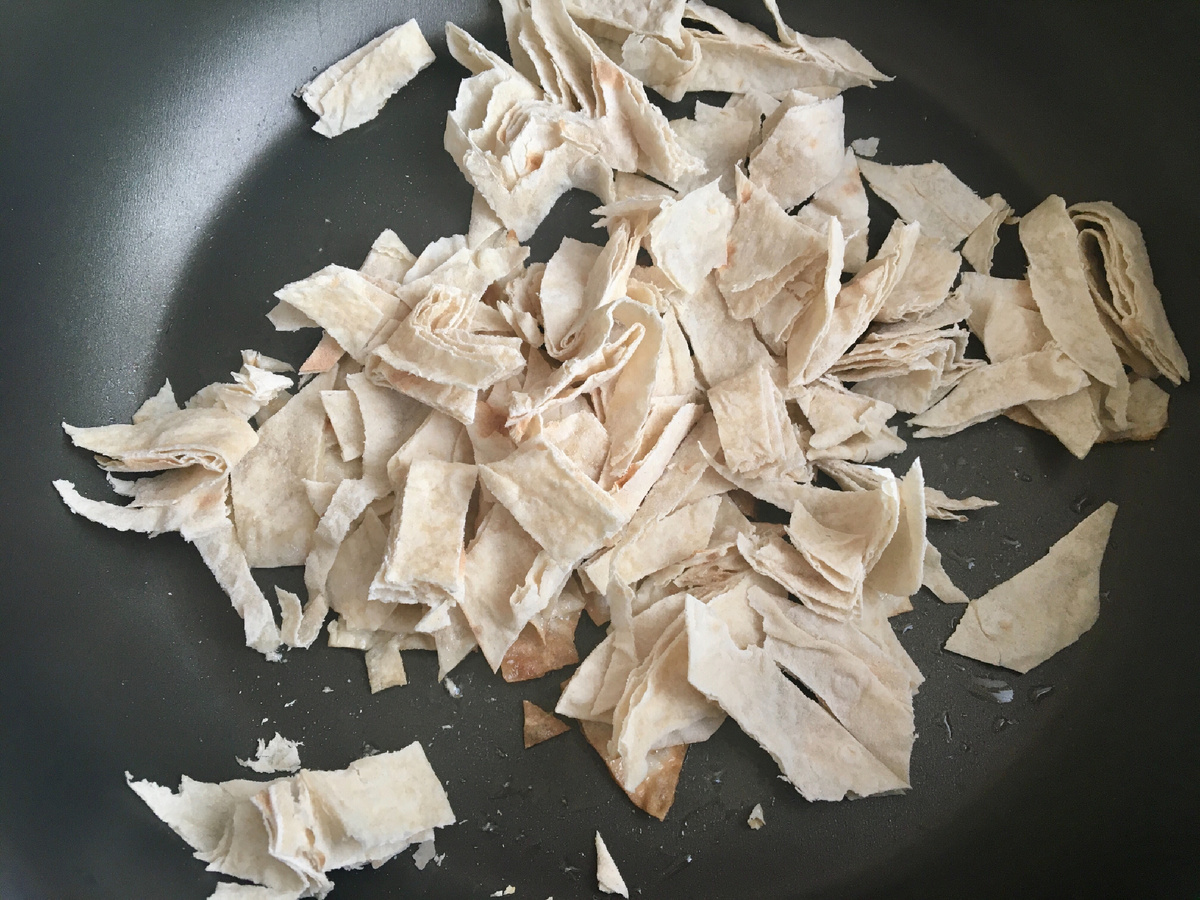 Берем лаваш и нарезаем его ножницами или рвём произвольно руками на сковороду с маслом, немного румяним его и добавляем колбасу.