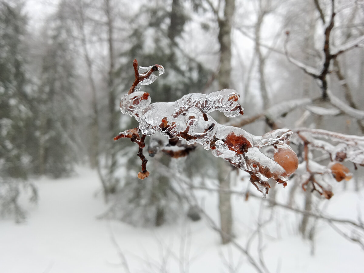 Накрапывал лёгкий дождик, приминая остатки снега, оголяя землю. Думалось мне это только у нас, здесь..., а уж в горах жди снегопада. Так и думал, держал лыжи под мышкой и ждал Алексея. Приближаясь к перевалам, становилось яснее и понятнее, что пригодятся ласты 😁. Была не была, с лыжами на перевес, оставляя следы косуль на снегу двинулись к месту импровизированного старта. Совместное фото и Алексей командует в путь! Даже намазанные бережно лыжи, то и дело проскальзывали, не имея опыта в сим благородном деле почти всю горку заполз «на руках». Зато спуски, даже маленькие, даже просто небольшие ямки закатывались легко и приятно. Тем временем моросил дождь, ветки лиственных и хвойных деревьев словно леденцы обросли блестящим льдом, как древние растения в плену янтаря. Палки то и дело проваливались в снег, лыжи зарывались в мокрые сугробы, но в целом идти было приятно, глаз то и дело цеплялся за невероятной красоты пейзажи, скрюченные рукой непогоды стволы деревьев, снежные шапки на тонких