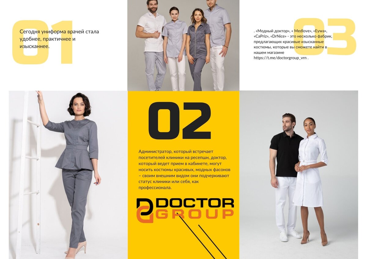 Выбор медицинского костюма зависит от специфики профессиональной деятельности. Администратор, который встречает посетителей клиники на ресепшн, доктор, который ведет прием в кабинете, могут носить костюмы красивых, модных фасонов – своим внешним видом они подчеркивают статус клиники или себя, как профессионала. Блузы с басками, пиджаки, платья, комбинезоны – сегодня модная индустрия пестрит эксклюзивными моделями. «Модный доктор», « Medlove», «Eywa», «CaPriz», «DrNice» - это несколько фабрик, предлагающих красивые изысканные костюмы, которые вы сможете найти в нашем магазине https://t.me/doctorgroup_vrn . Врачи, выполняющие активную работу: хирурги, стоматологи, массажисты и т.д., с удовольствием приобретут костюмы, которые по своим свойствам приближены к спортивным. Удобный крой, специальные эластичные ткани, помогут осуществлять свою профессиональную деятельность с большим комфортом. В этой сфере производства костюмов, свои позиции заслуженно завоевала одежда Американских брендов (