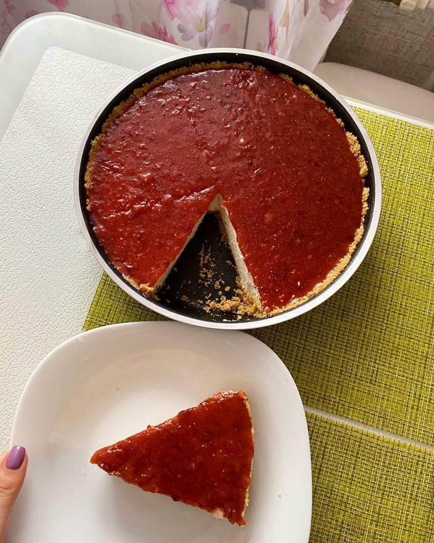 Ингредиенты: печенье юбилейное, сливочное масло, клубника или клубничное варенье, желатин, вода, сливки 33%, творожный сыр, сахарная пудра Способ приготовления: Печенье измельчить в блендере и добавить мягкое сливочное масло. Выложить на дно формы тонким слоем, формируя бортики. Поставить застывать в холодильник на 30 минут. 50 г тёплой воды добавить 10 г желатина и оставить набухать 20 минут. Взбить сливки до мягких пиков 3-5 минут, добавить творожный сыр и сахарную пудру и снова взбить. Желатин подогреть в микроволновке или на водяной бане и добавить тоже, перемешать. Достать форму из холодильника, залить получившейся массу и убрать в холодильник на 30 минут. 50 г тёплой воды добавить 10 г желатина и оставить набухать 20 минут. В клубничное варенье добавить желатин разогретый в микроволновке, перемешать, достать форму и залить ещё один слой. Убрать в холодильник до полного застывания ещё на 30-50 минут.